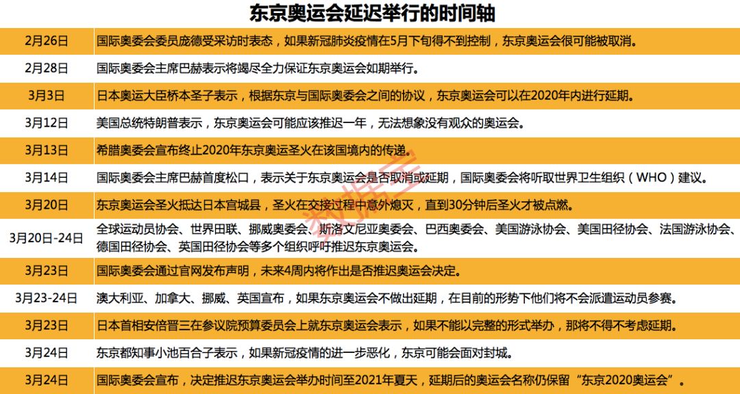 24日,在日本首相安倍晋三的提议下,国际奥委会与日本政府等各方经过商议后,宣布推迟东京奥运会举办时间至2021年夏天,延期后的奥运会名称仍保留“东京2020奥运会”。