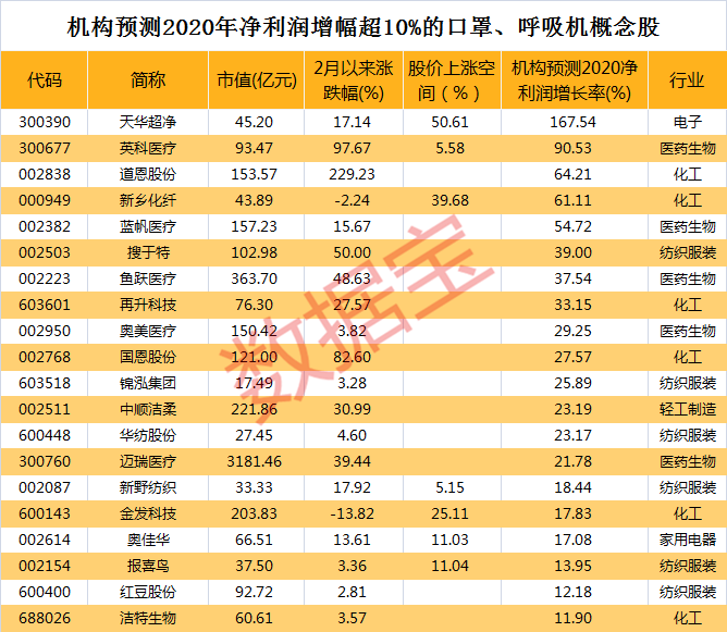 虽然在近期市场大幅波动情形下,口罩、呼吸机概念股也大幅回撤。但是海外疫情的发展似乎仍然没有出现拐点,口罩、呼吸机的需求相对往年也在大增,业绩、股价或还具备一定上涨空间。数据宝统计显示,截至当前,机构预测20股今年业绩增幅超过20%,其中5股上涨空间超10%。