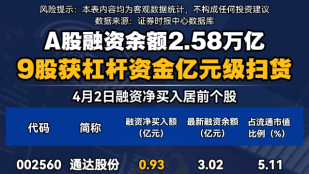 截至4月2日A股融资余额2.58万亿 9股获...