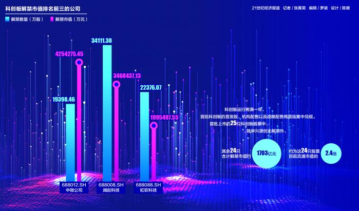 排在第二、第三位的分别是中微公司、澜起科技,解禁市值分别是425.4亿元、346.8亿元。这两家也是目前科创板总市值排在前三位的公司。