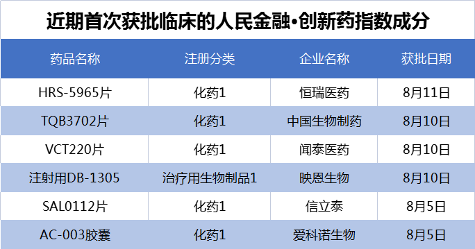 在新发布周期内,来自恒瑞医药、中国生物制药、闻泰医药等的6个创新药项目首次获批临床,包括1个生物药、6个化药,我们将其纳入了“人民金融·创新药指数”。目前,“人民金融·创新药指数”的成分样本共有1495个。