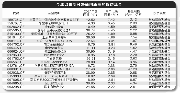 证券时报e公司讯,新年伊始,A股风格大变,新能源、半导体、军工等赛道股高位剧烈震荡,稳增长板块强势崛起,高低切换明显。记者梳理发现,今年以来有36只权益基金净值创下新高,还有中庚小盘价值、中泰玉衡价值优选、中欧恒利三年定开、中庚价值灵动灵活配置、中欧潜力价值A和广发价值领先A等去年的高增长、低回撤基金产品表现强势。除此之外,开年以来,以地产产业链、银行为代表的稳增长板块表现稳健,也是不少基金净值飘红的最大催化剂。