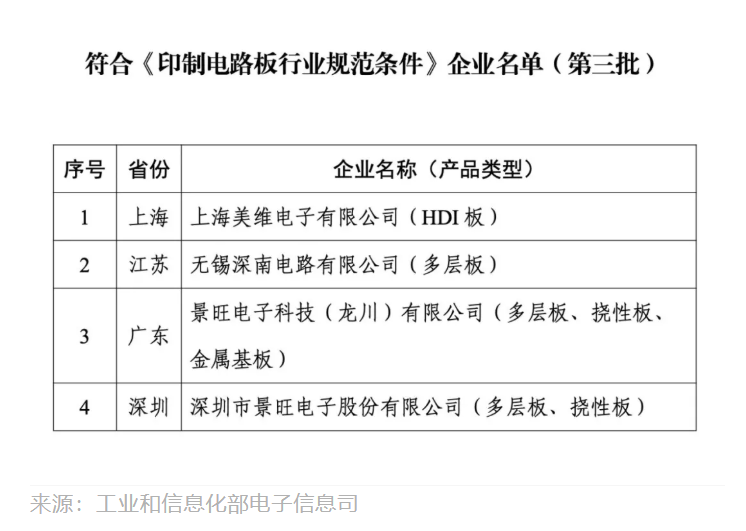 证券时报e公司讯,工信部:根据《印制电路板行业规范条件》及《印制电路板行业规范公告管理暂行办法》规定,经企业申报、省级工业和信息化主管部门推荐、专家复核、网上公示等程序,工业和信息化部确定符合《印制电路板行业规范条件》企业名单(第三批),现予以公告。