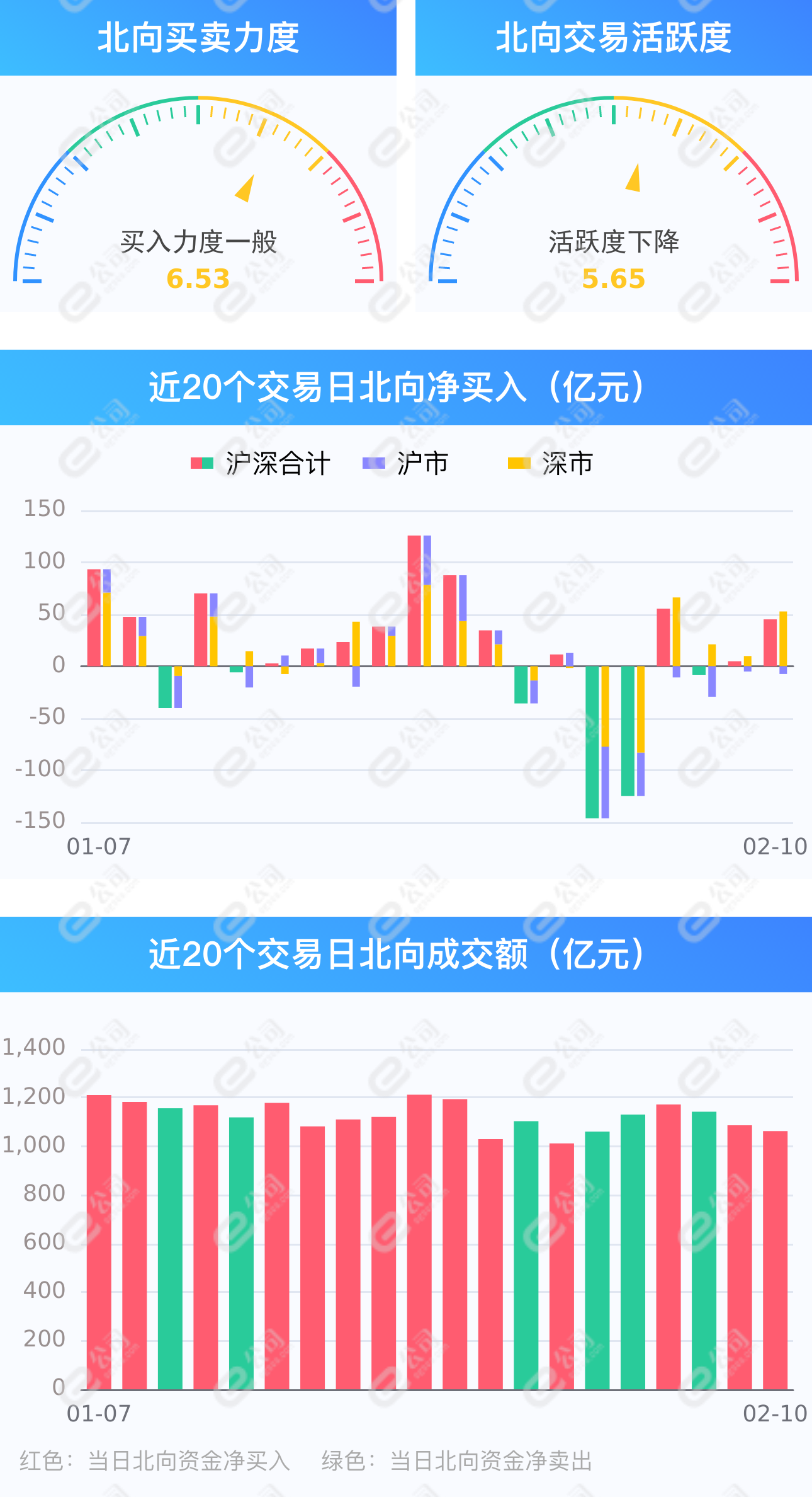 证券时报网讯,2月10日,截至A股收盘,统计数据显示北向资金合计净买入45.21亿元,其中沪股通净买入52.71亿元,深股通净卖出7.5亿元。北向资金成交金额1062.27亿元,占A股总成交额11.42%,交易活跃度下降2.22%,其中沪股通买入金额271.24亿元,卖出金额218.53亿元,深股通买入金额282.50亿元,卖出金额290.00亿元。