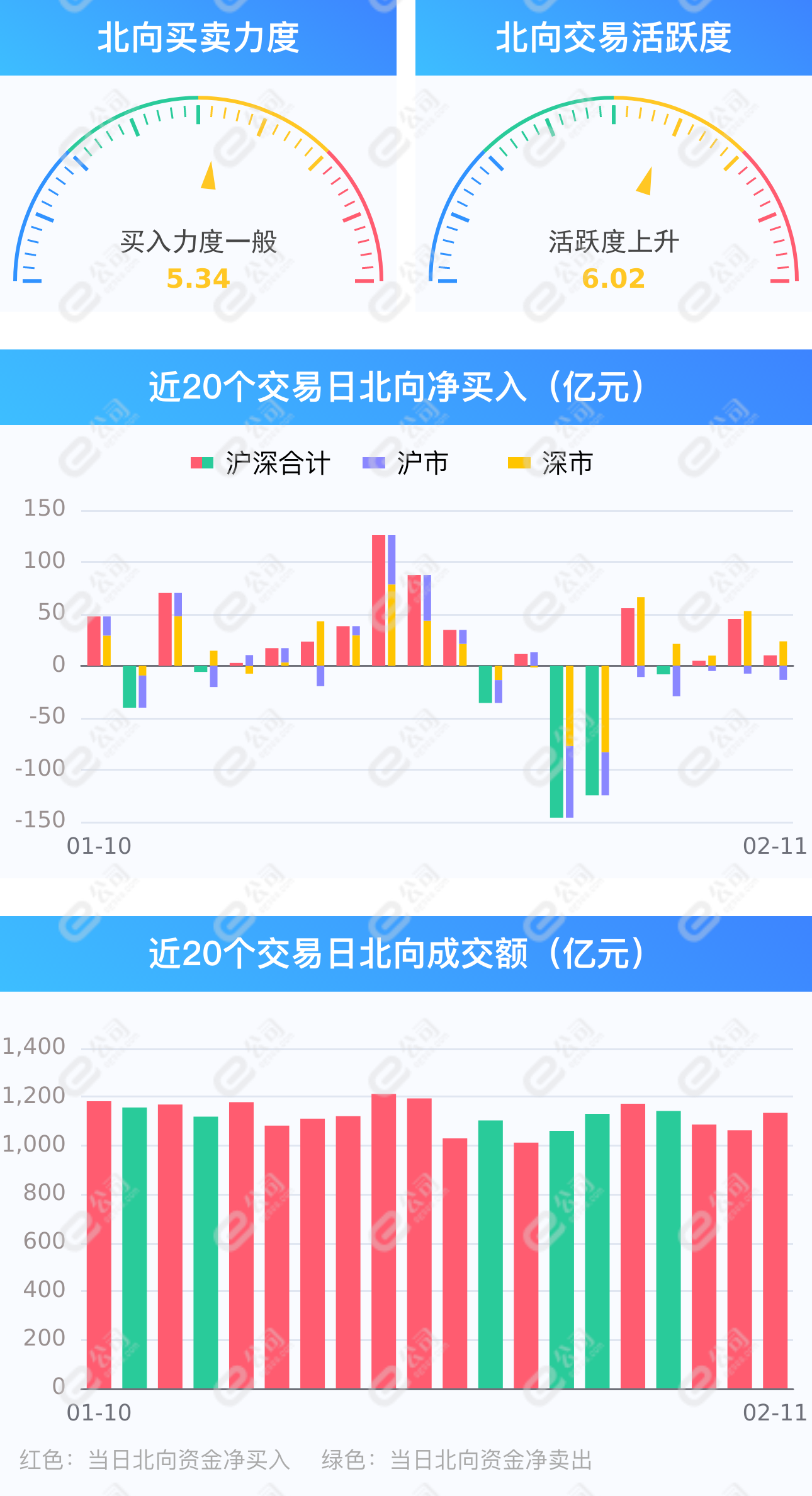 证券时报网讯,2月11日,截至A股收盘,统计数据显示北向资金合计净买入10.05亿元,其中沪股通净买入23.59亿元,深股通净卖出13.54亿元。北向资金成交金额1134.00亿元,占A股总成交额11.51%,交易活跃度上升6.75%,其中沪股通买入金额275.74亿元,卖出金额252.15亿元,深股通买入金额296.28亿元,卖出金额309.82亿元。