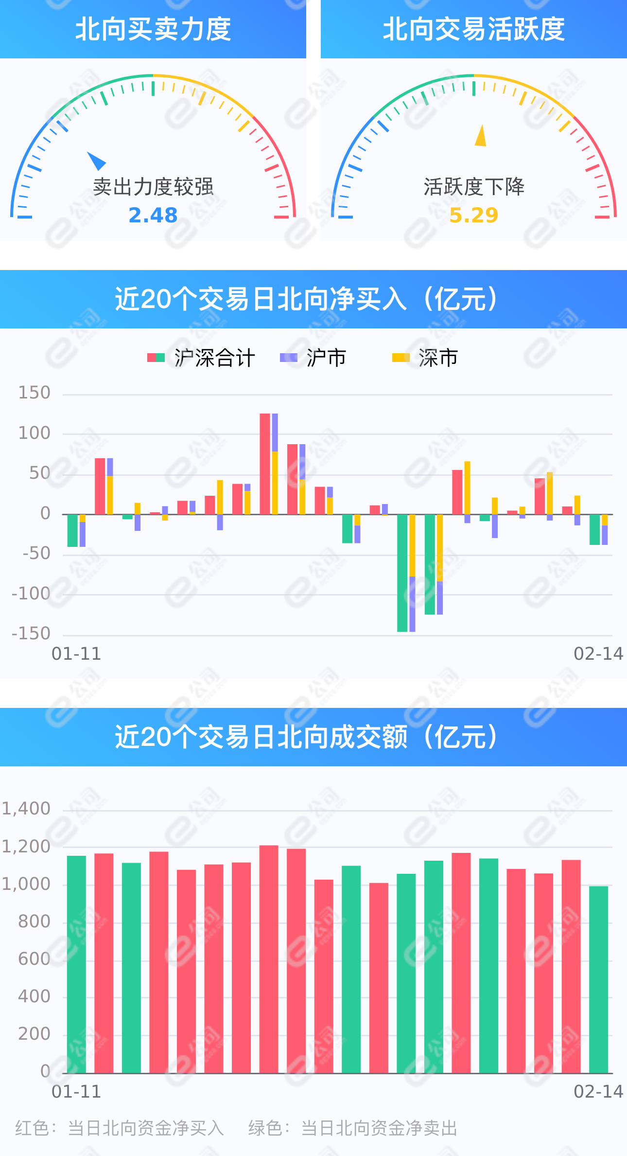 证券时报e公司讯,2月14日,截至A股收盘,统计数据显示北向资金合计净卖出37.88亿元,其中沪股通净卖出13.7亿元,深股通净卖出24.18亿元。北向资金成交金额994.35亿元,占A股总成交额11.60%,交易活跃度下降12.31%,其中沪股通买入金额215.36亿元,卖出金额229.06亿元,深股通买入金额262.88亿元,卖出金额287.06亿元。北向资金中止连续3日净买入。(此稿由证券时报e公司写稿机器人“快手小e”完成。)