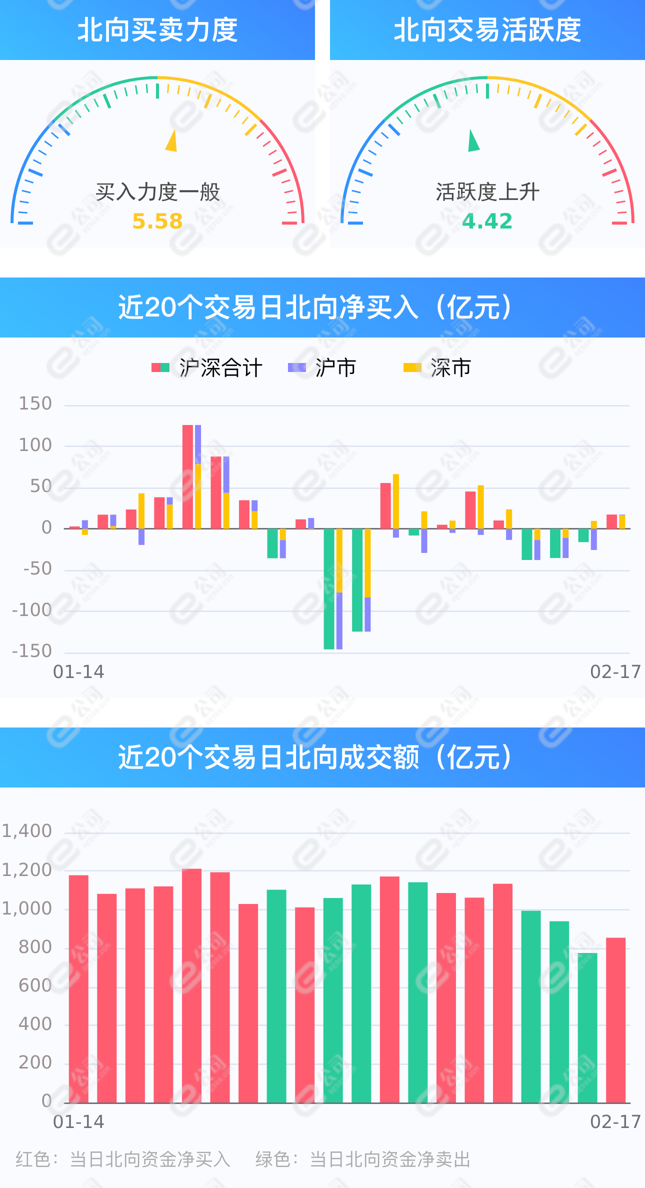 证券时报e公司讯,2月17日,截至A股收盘,统计数据显示北向资金合计净买入17.21亿元,其中沪股通净买入16.37亿元,深股通净买入0.84亿元。北向资金成交金额854.31亿元,占A股总成交额9.47%,交易活跃度上升10.24%,其中沪股通买入金额203.12亿元,卖出金额186.75亿元,深股通买入金额232.64亿元,卖出金额231.80亿元。北向资金中止连续3日净卖出。(此稿由证券时报e公司写稿机器人“快手小e”完成。)