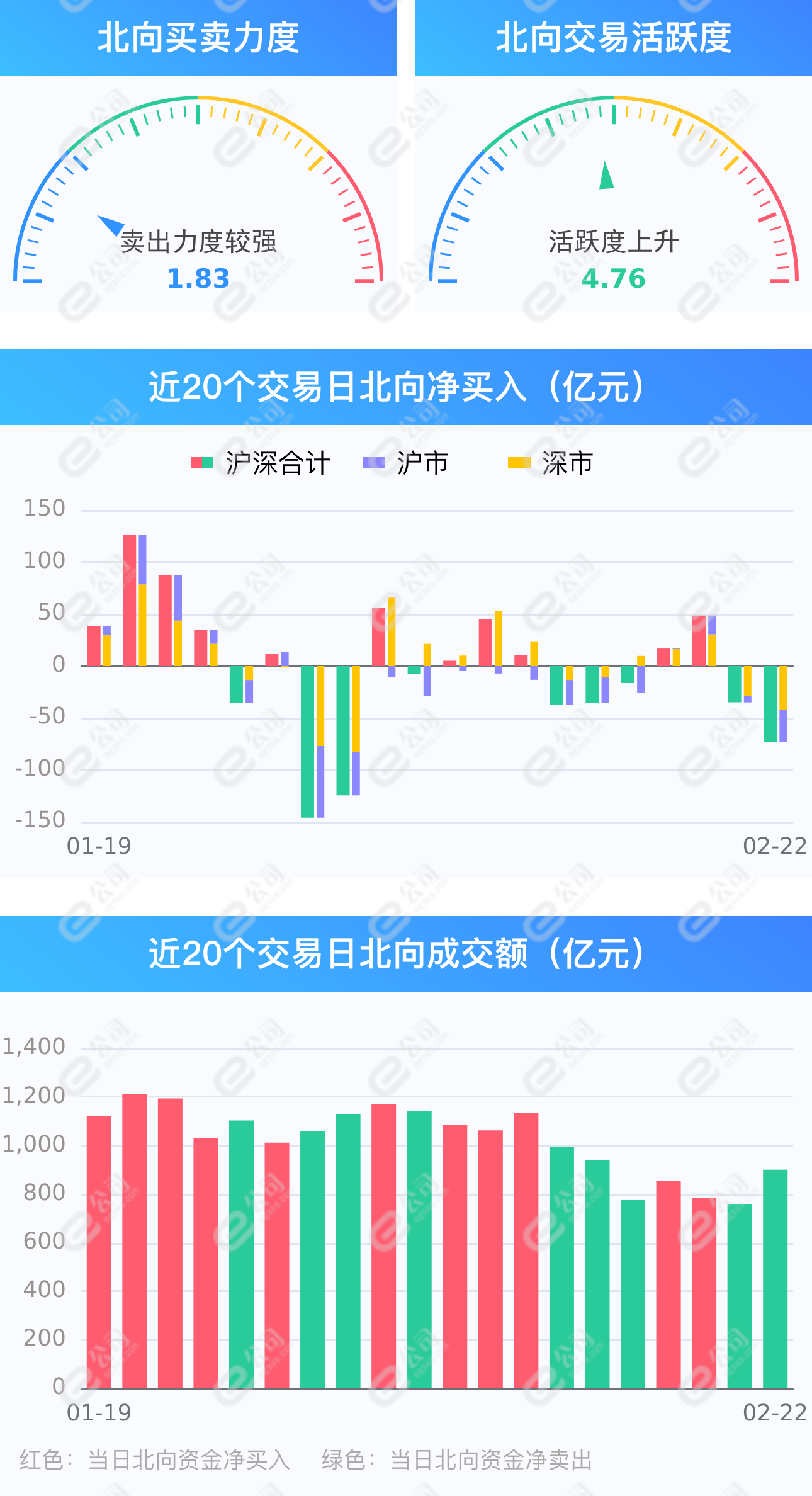 证券时报网讯,2月22日,截至A股收盘,统计数据显示北向资金合计净卖出73.40亿元,其中沪股通净卖出42.42亿元,深股通净卖出30.98亿元。