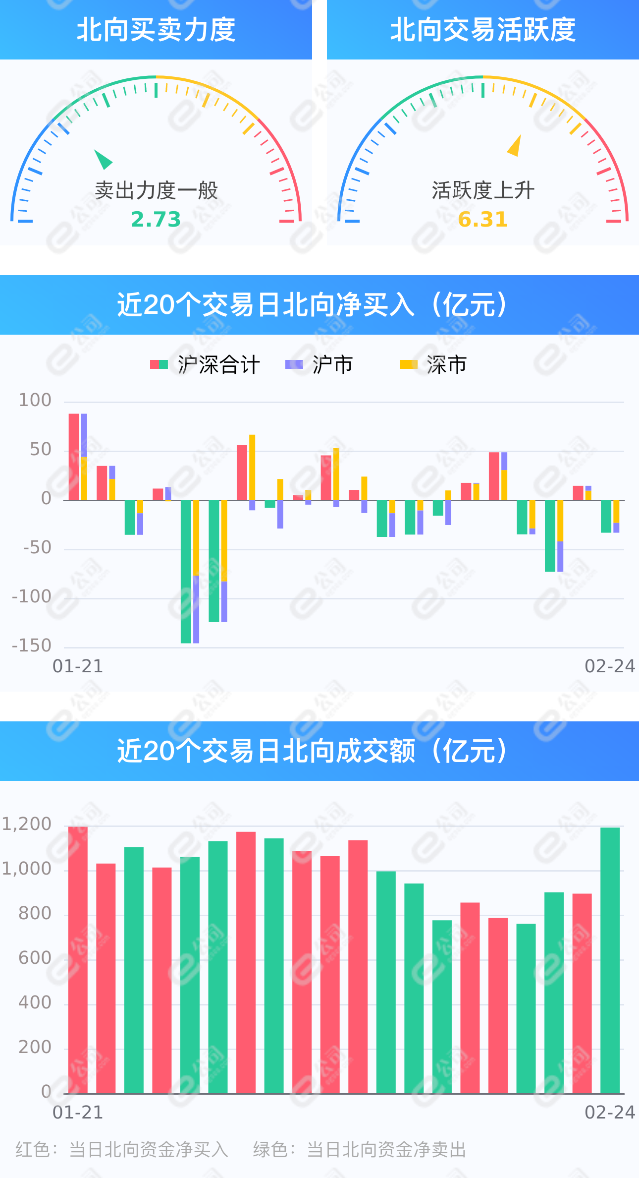 证券时报网讯,2月24日,截至A股收盘,统计数据显示北向资金合计净卖出33.58亿元,其中沪股通净卖出23.56亿元,深股通净卖出10.02亿元。