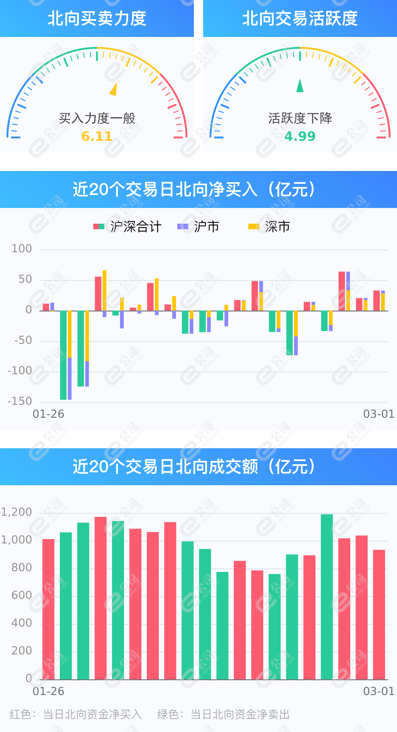 证券时报e公司讯,3月1日,截至A股收盘,统计数据显示北向资金合计净买入32.77亿元,其中沪股通净买入28.07亿元,深股通净买入4.7亿元。北向资金成交金额933.83亿元,占A股总成交额9.70%,交易活跃度下降9.96%,其中沪股通买入金额238.16亿元,卖出金额210.09亿元,深股通买入金额245.14亿元,卖出金额240.44亿元。(此稿由证券时报e公司写稿机器人“快手小e”完成。)(违法和不良信息举报电话:0755-83514034 邮箱:bwb@stcn.com)