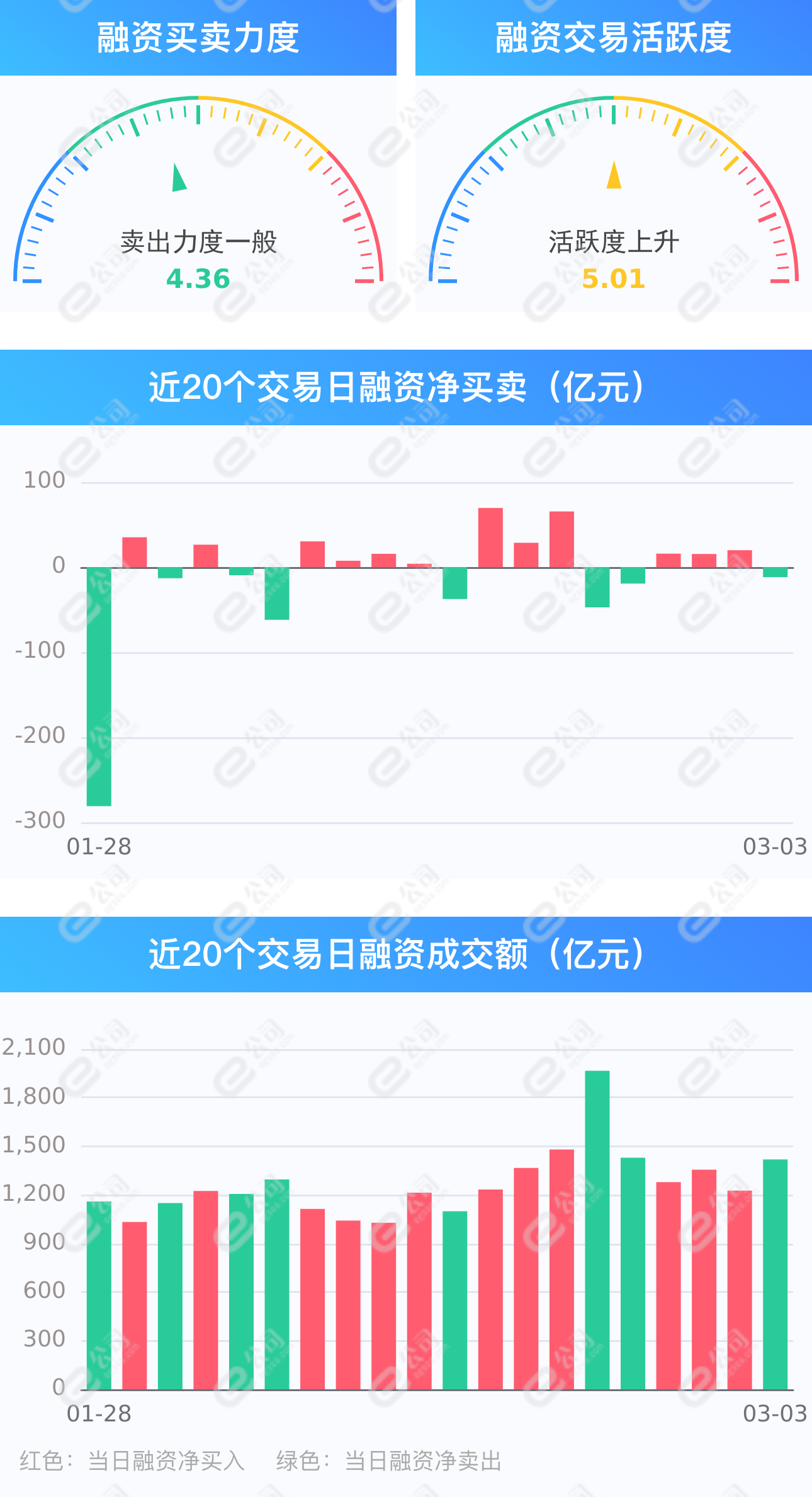 证券时报e公司讯,截至3月3日,上交所融资余额报8583.43亿元,较前一交易日减少7.1亿元;深交所融资余额报7751.06亿元,较前一交易日减少4.74亿元;两市合计16334.49亿元,较前一交易日减少11.83亿元,融资交易额1418.01亿元,占A股成交额14.13%,其中融资买入额703.09亿元,融资偿还额714.92亿元,交易活跃度上升15.63%。统计发现,融资客中止连续3日净买入。(此稿由证券时报e公司写稿机器人“快手小e”完成。)