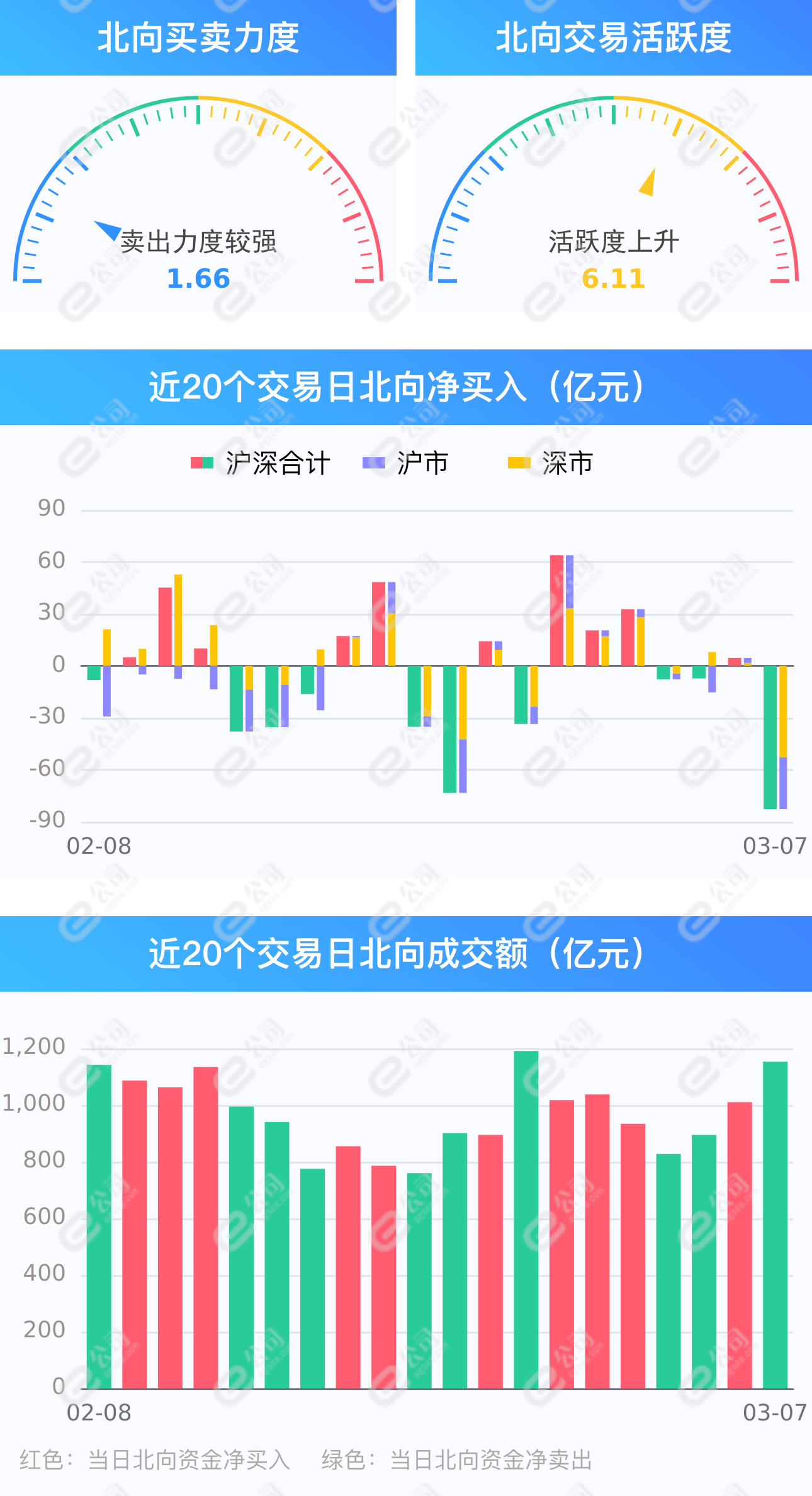 证券时报网讯,3月7日,截至A股收盘,统计数据显示北向资金合计净卖出82.72亿元,其中沪股通净卖出52.86亿元,深股通净卖出29.86亿元。北向资金成交金额1152.87亿元,占A股总成交额11.32%,交易活跃度上升14.13%,其中沪股通买入金额258.03亿元,卖出金额310.89亿元,深股通买入金额277.05亿元,卖出金额306.91亿元。