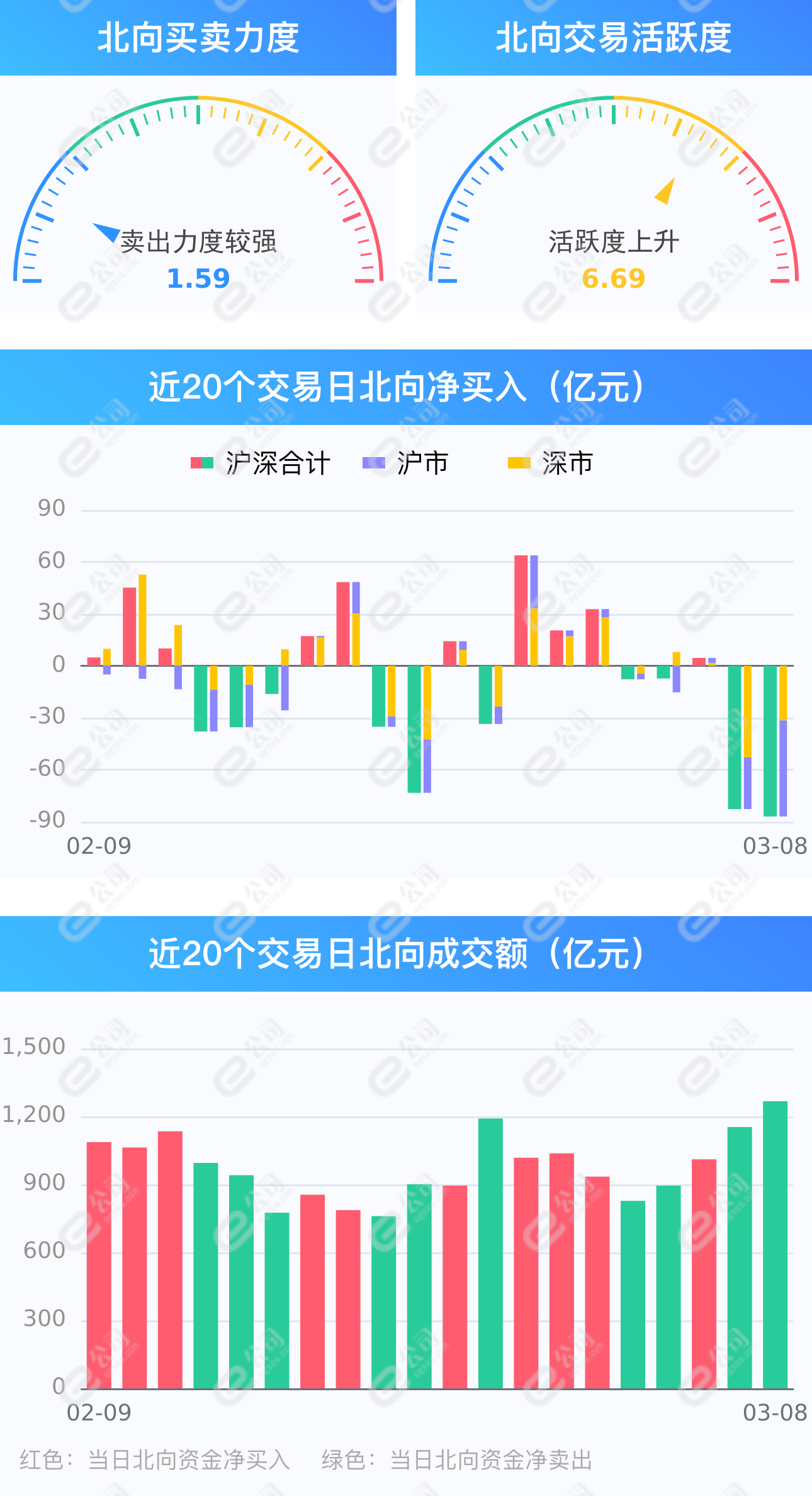 证券时报网讯,3月8日,截至A股收盘,统计数据显示北向资金合计净卖出86.99亿元,其中沪股通净卖出31.51亿元,深股通净卖出55.48亿元。北向资金成交金额1266.35亿元,占A股总成交额11.47%,交易活跃度上升9.84%,其中沪股通买入金额286.97亿元,卖出金额318.48亿元,深股通买入金额302.71亿元,卖出金额358.19亿元。