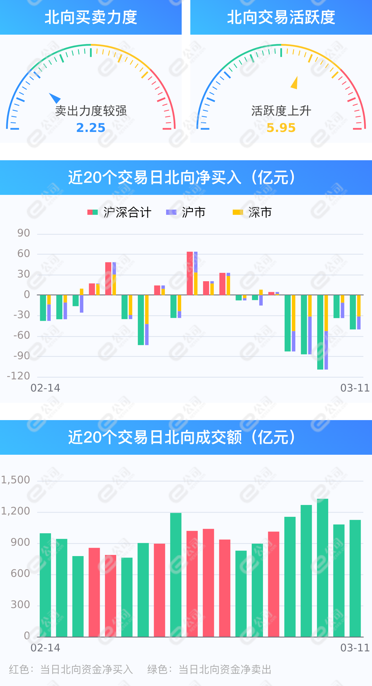 证券时报网讯,3月11日,截至A股收盘,统计数据显示北向资金合计净卖出50.42亿元,其中沪股通净卖出31.42亿元,深股通净卖出19亿元。北向资金成交金额1122.82亿元,占A股总成交额10.76%,交易活跃度上升4.06%,其中沪股通买入金额248.34亿元,卖出金额279.76亿元,深股通买入金额287.85亿元,卖出金额306.85亿元。北向资金保持连续5日净卖出,净卖出额分别为82.72亿元、86.99亿元、109.35亿元、33.74亿元、50.42亿元,合计净卖出363.22亿元。
