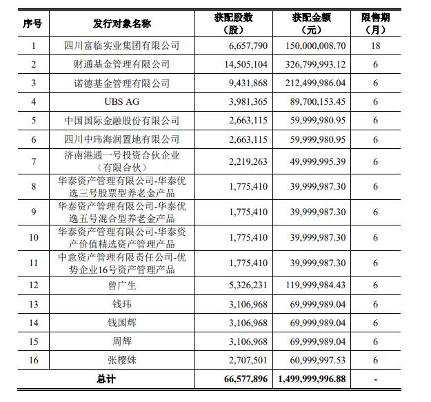 证券时报e公司讯,3月15日,富临精工(300432)发布公告,完成定增募资14.99亿元,定向发行股份总额为6657.79万股,发行价格为22.53元/股。公告显示,众多投资机构参与竞价认购,最终控股股东富临集团、财通基金、诺德基金、瑞银集团(UBS AG)、中金公司、华泰资产等10余家投资方获得认购获配。