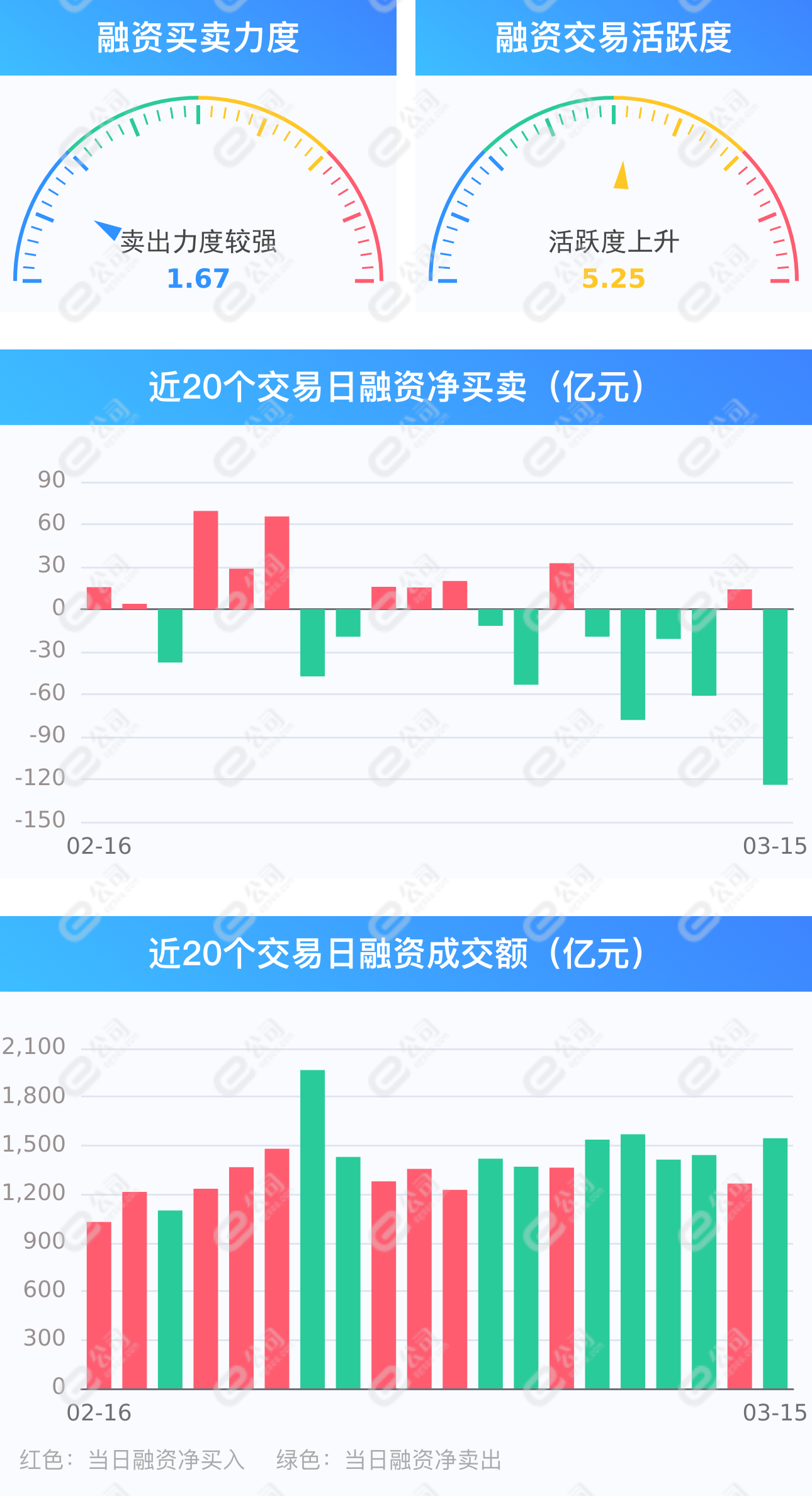 证券时报e公司讯,截至3月15日,上交所融资余额报8486.23亿元,较前一交易日减少58.94亿元;深交所融资余额报7537.42亿元,较前一交易日减少65.1亿元;两市合计16023.66亿元,较前一交易日减少124.04亿元,融资交易额1544.81亿元,占A股成交额13.83%,其中融资买入额710.38亿元,融资偿还额834.43亿元,交易活跃度上升22.16%。