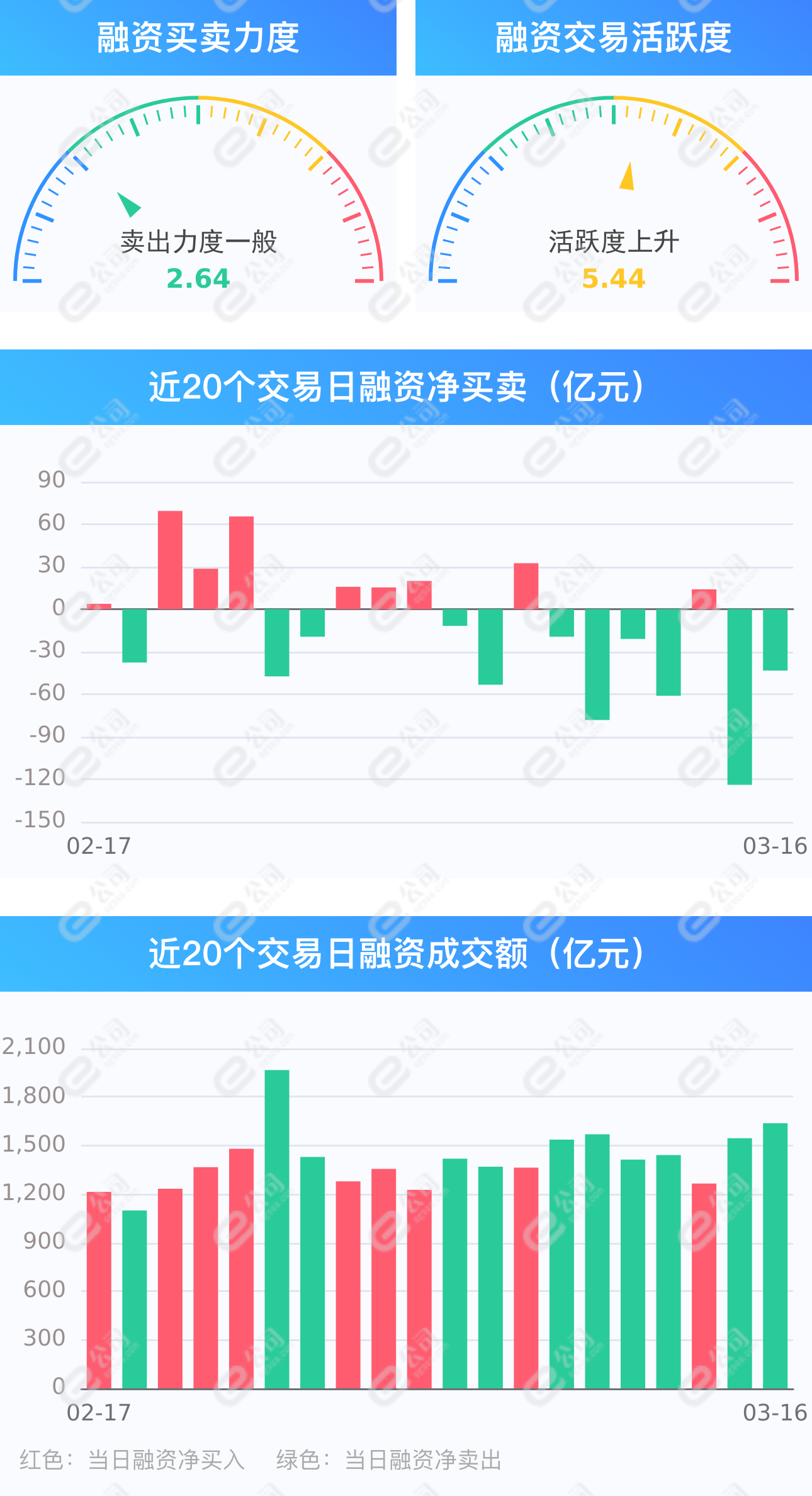 证券时报e公司讯,截至3月16日,上交所融资余额报8461.94亿元,较前一交易日减少24.29亿元;深交所融资余额报7518.33亿元,较前一交易日减少19.09亿元;两市合计15980.27亿元,较前一交易日减少43.38亿元,融资交易额1637.67亿元,占A股成交额13.82%,其中融资买入额797.14亿元,融资偿还额840.52亿元,交易活跃度上升6.01%。
