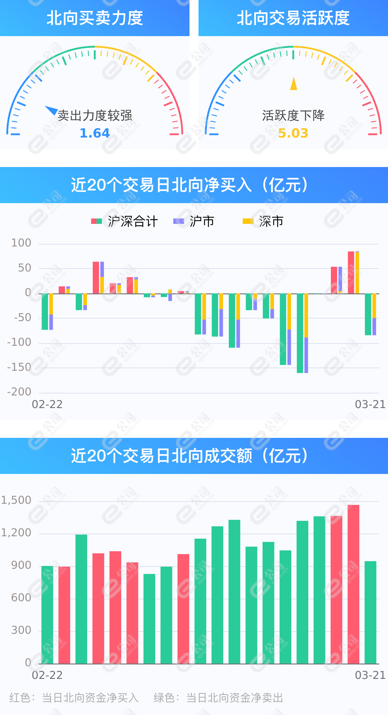 证券时报网讯,3月21日,截至A股收盘,统计数据显示北向资金合计净卖出84.20亿元,其中沪股通净卖出49.54亿元,深股通净卖出34.66亿元。北向资金成交金额945.34亿元,占A股总成交额9.38%,交易活跃度下降35.47%,其中沪股通买入金额197.52亿元,卖出金额247.06亿元,深股通买入金额233.05亿元,卖出金额267.71亿元。