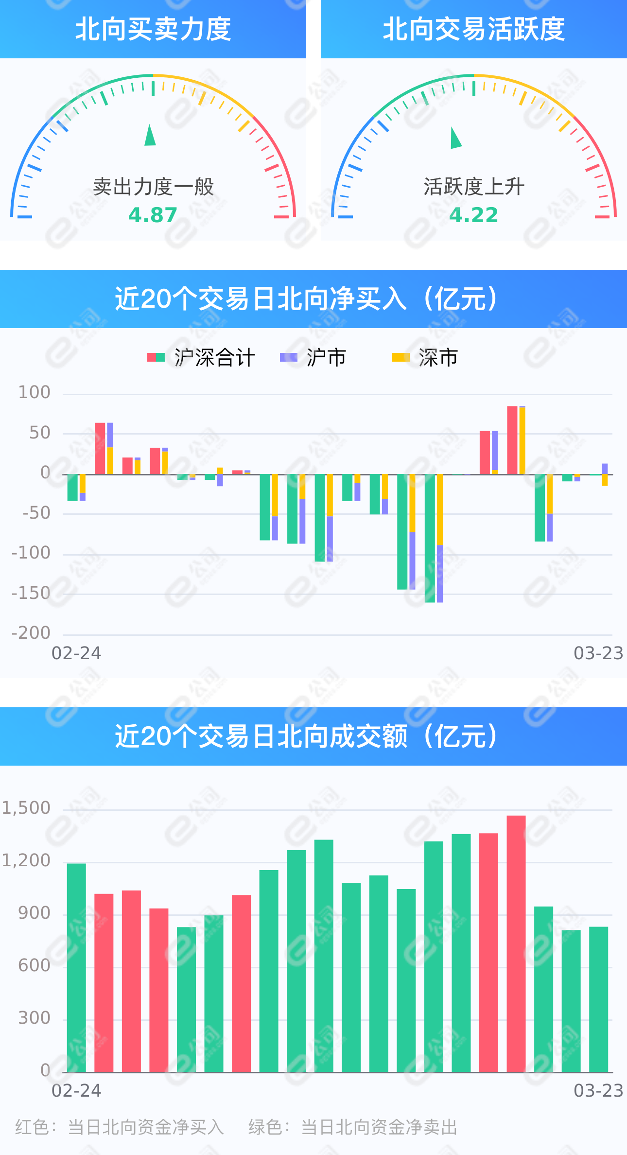 证券时报网讯,3月23日,截至A股收盘,统计数据显示北向资金合计净卖出1.94亿元,其中沪股通净卖出14.91亿元,深股通净买入12.97亿元。北向资金成交金额829.33亿元,占A股总成交额8.86%,交易活跃度上升2.36%,其中沪股通买入金额197.00亿元,卖出金额211.91亿元,深股通买入金额216.70亿元,卖出金额203.73亿元。
