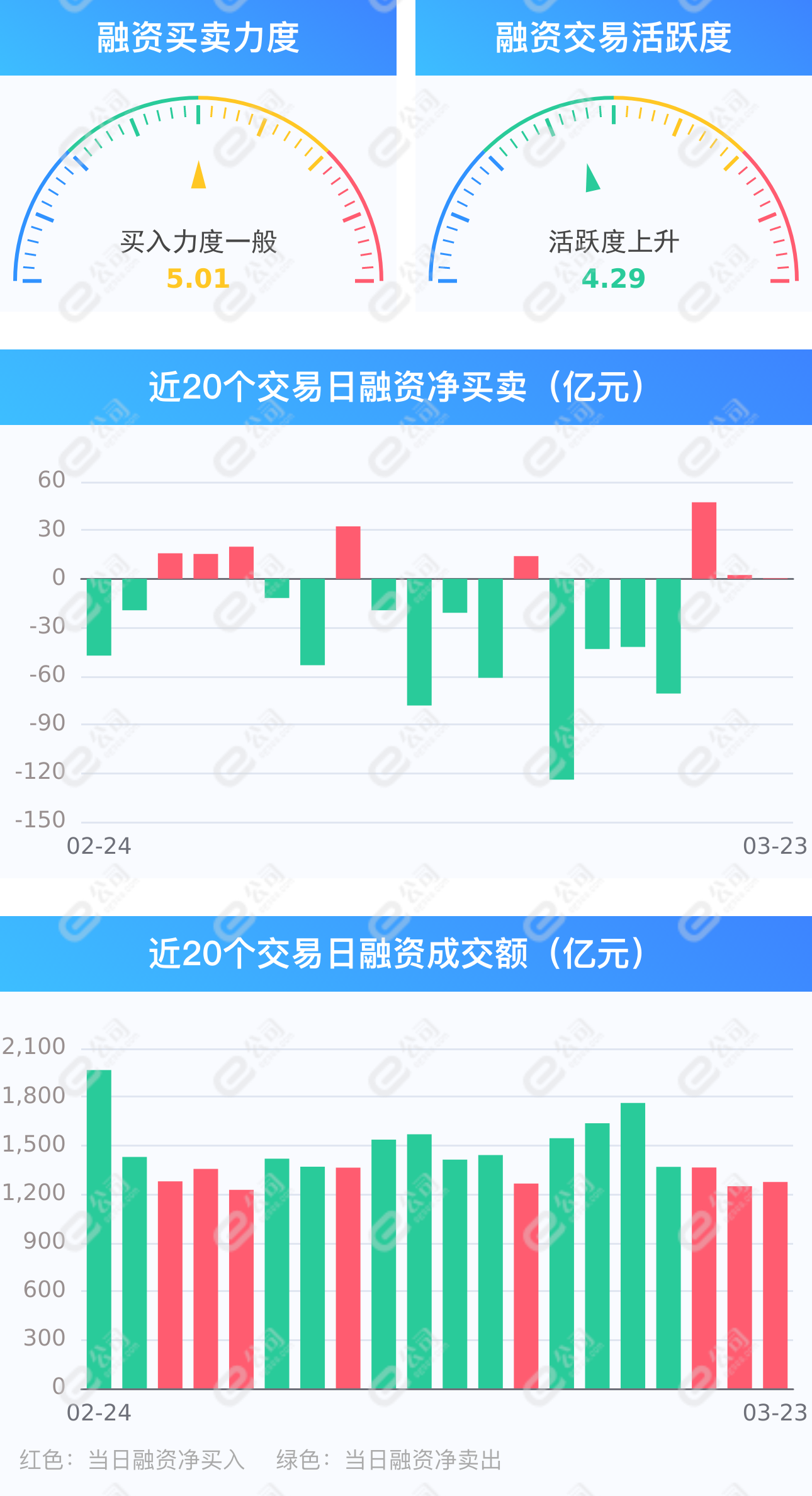 证券时报e公司讯,截至3月23日,上交所融资余额报8403.33亿元,较前一交易日增加2.41亿元;深交所融资余额报7514.07亿元,较前一交易日减少2.01亿元;两市合计15917.40亿元,较前一交易日增加0.40亿元,融资交易额1274.90亿元,占A股成交额13.62%,其中融资买入额637.65亿元,融资偿还额637.25亿元,交易活跃度上升2.10%。