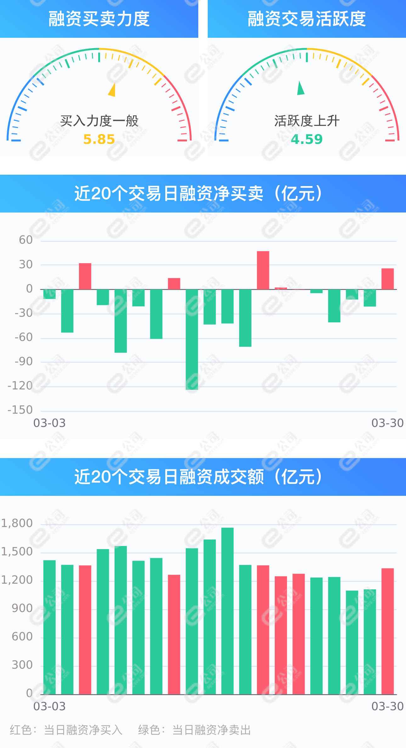 证券时报e公司讯,截至3月30日,上交所融资余额报8379.64亿元,较前一交易日增加20.67亿元;深交所融资余额报7484.64亿元,较前一交易日增加5.27亿元;两市合计15864.28亿元,较前一交易日增加25.94亿元,融资交易额1332.23亿元,占A股成交额14.01%,其中融资买入额679.08亿元,融资偿还额653.14亿元,交易活跃度上升20.03%。统计发现,融资客中止连续4日净卖出。