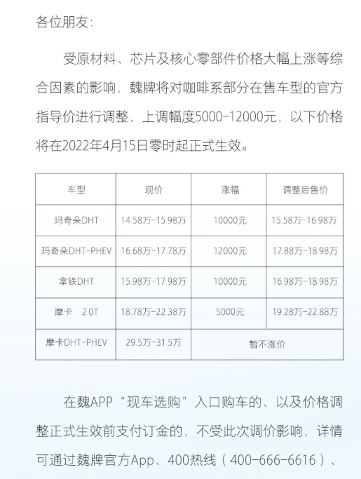 证券时报e公司讯,4月12日,长城汽车旗下魏牌官微发布关于魏牌产品价格调整的说明:受原材料、芯片及核心零部件价格大幅上涨等综合因素的影响,魏牌将对咖啡系部分在售车型的官方指导价进行调整,上调幅度5000-12000元,将在2022年4月15日零时起正式生效。