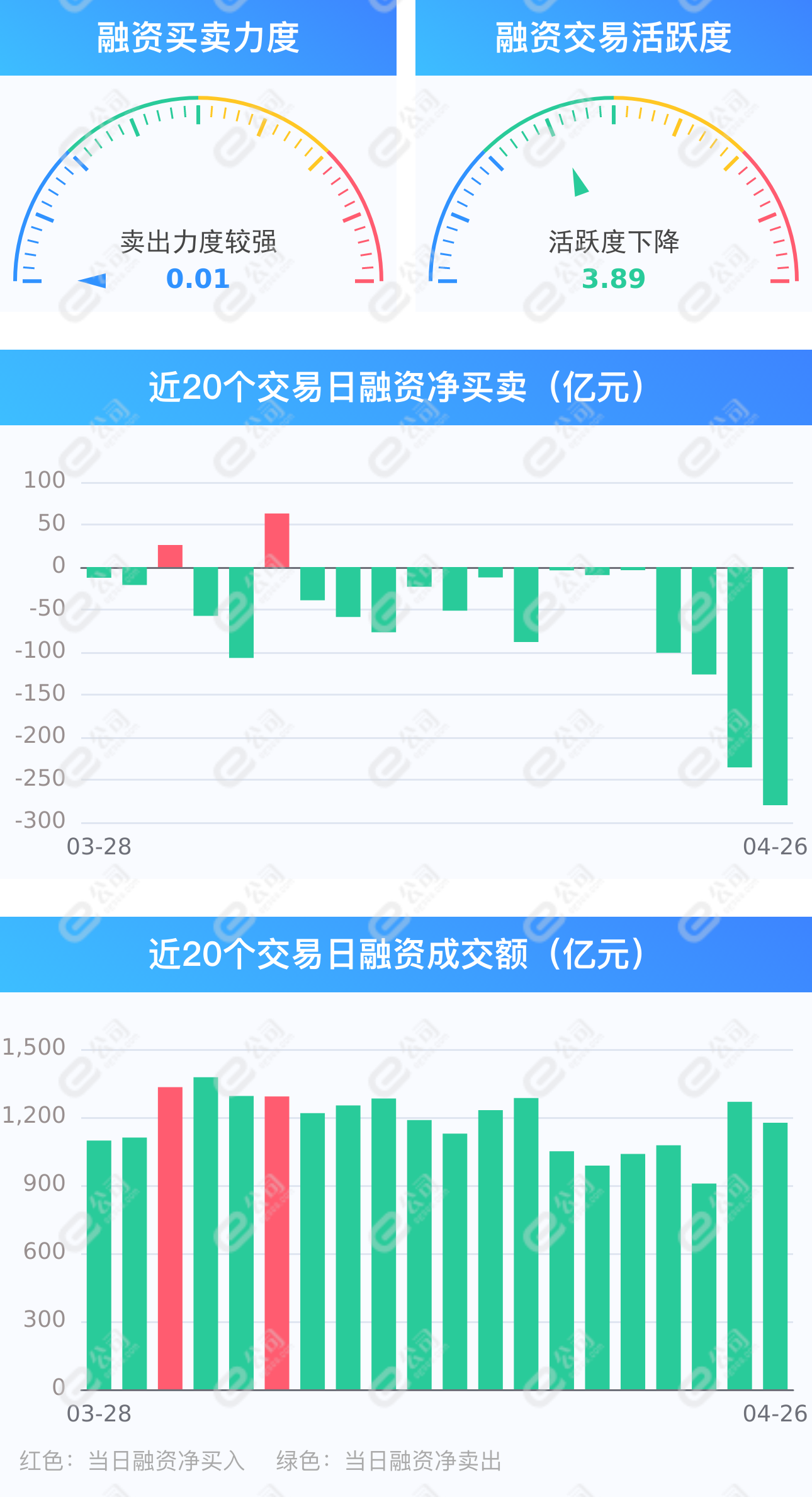 证券时报e公司讯,截至4月26日,上交所融资余额报7853.42亿元,较前一交易日减少134.35亿元;深交所融资余额报6801.08亿元,较前一交易日减少145.6亿元;两市合计14654.50亿元,较前一交易日减少279.95亿元。统计发现,融资客保持连续14日净卖出,合计1108.56亿元。