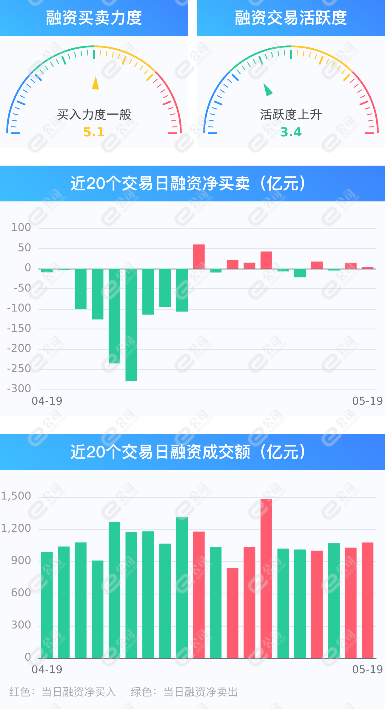 证券时报e公司讯,截至5月19日,上交所融资余额报7772.72亿元,较前一交易日增加4.25亿元;深交所融资余额报6694.66亿元,较前一交易日减少1.13亿元;两市合计14467.39亿元,较前一交易日增加3.12亿元,融资交易额1075.29亿元,占A股成交额13.41%,其中融资买入额539.20亿元,融资偿还额536.09亿元,交易活跃度上升4.67%。