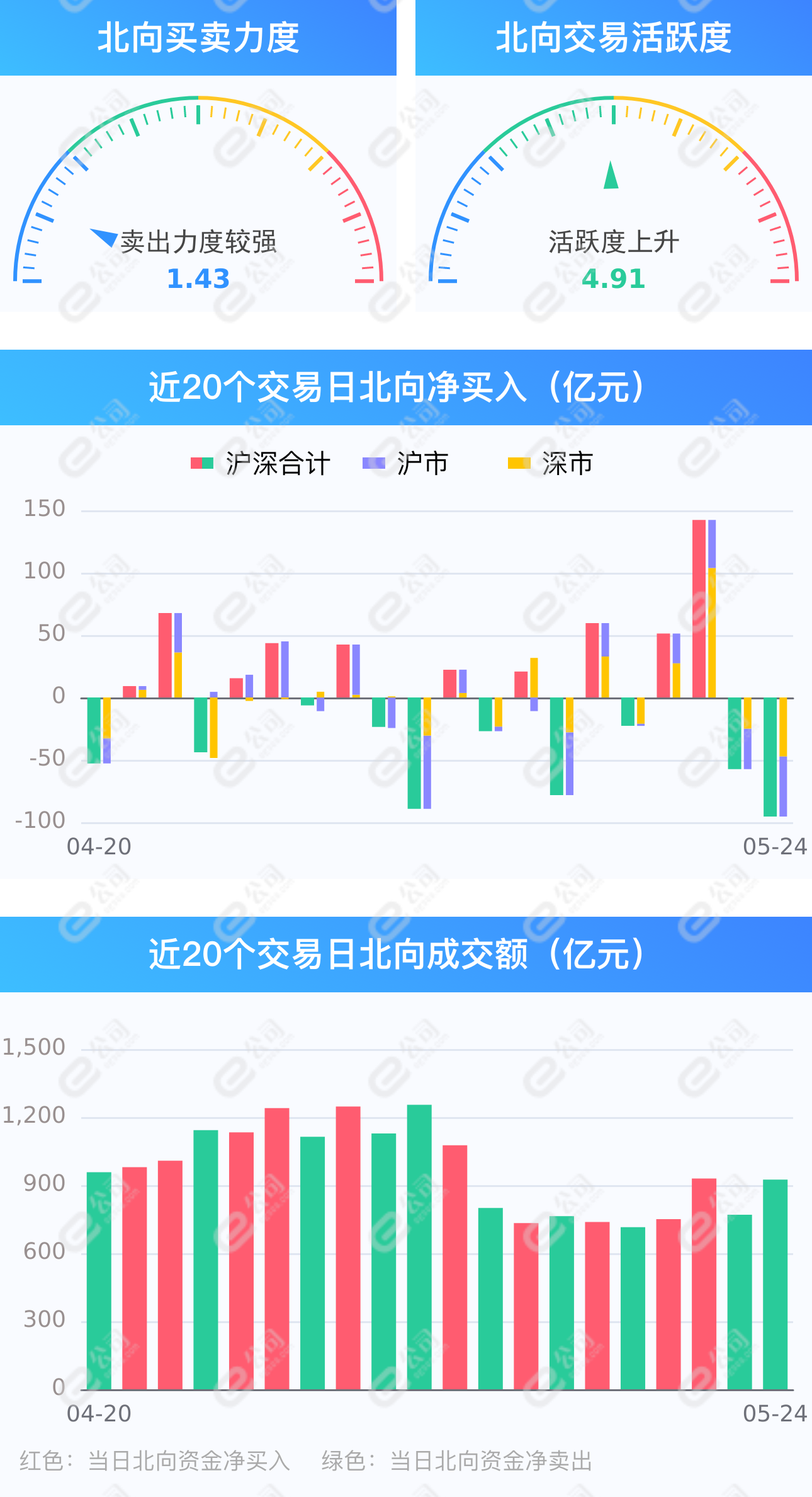 证券时报e公司讯,5月24日,截至A股收盘,统计数据显示北向资金合计净卖出95.50亿元,其中沪股通净卖出47.39亿元,深股通净卖出48.11亿元。北向资金成交金额924.54亿元,占A股总成交额9.37%,交易活跃度上升20.15%,其中沪股通买入金额188.32亿元,卖出金额235.71亿元,深股通买入金额226.20亿元,卖出金额274.31亿元。(此稿由证券时报e公司写稿机器人“快手小e”完成。)