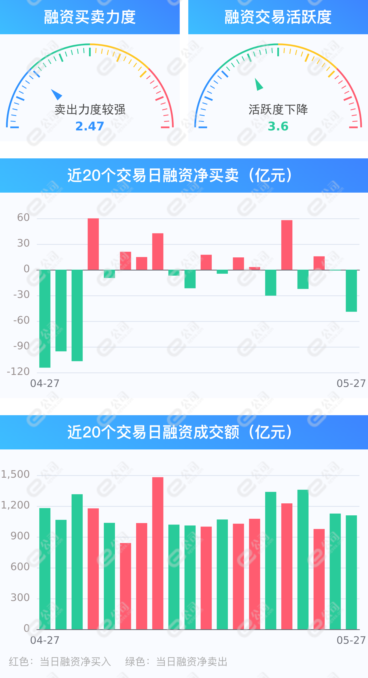 证券时报e公司讯,截至5月27日,上交所融资余额报7739.04亿元,较前一交易日减少29.57亿元;深交所融资余额报6698.90亿元,较前一交易日减少19.56亿元;两市合计14437.94亿元,较前一交易日减少49.13亿元,融资交易额1108.16亿元,占A股成交额13.64%,其中融资买入额529.52亿元,融资偿还额578.64亿元,交易活跃度下降1.54%。