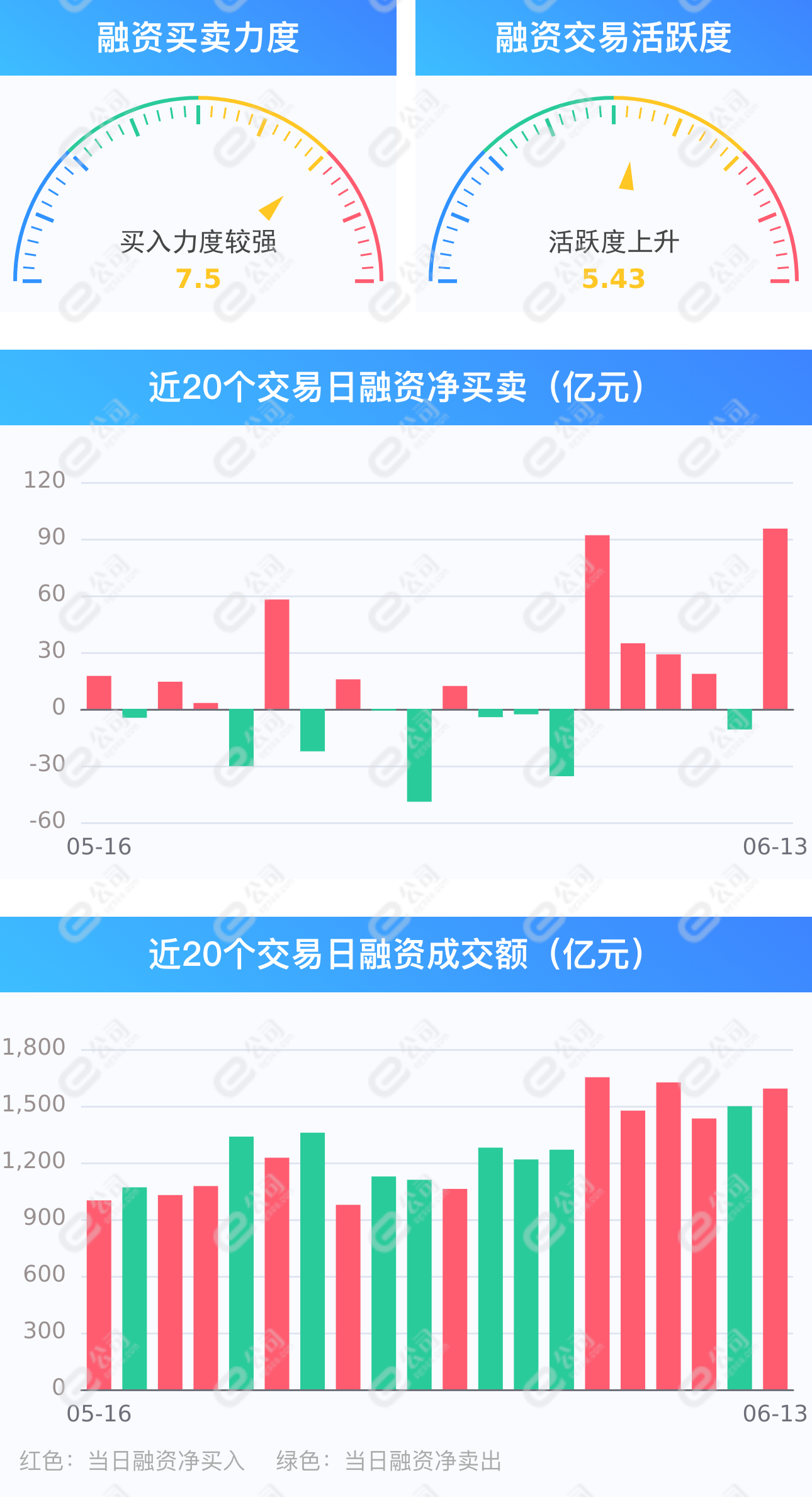 证券时报e公司讯,截至6月13日,上交所融资余额报7883.59亿元,较前一交易日增加61.02亿元;深交所融资余额报6781.70亿元,较前一交易日增加34.27亿元;两市合计14665.29亿元,较前一交易日增加95.30亿元,融资交易额1591.15亿元,占A股成交额14.64%,其中融资买入额843.22亿元,融资偿还额747.92亿元,交易活跃度上升6.26%。(此稿由证券时报e公司写稿机器人“快手小e”完成。)