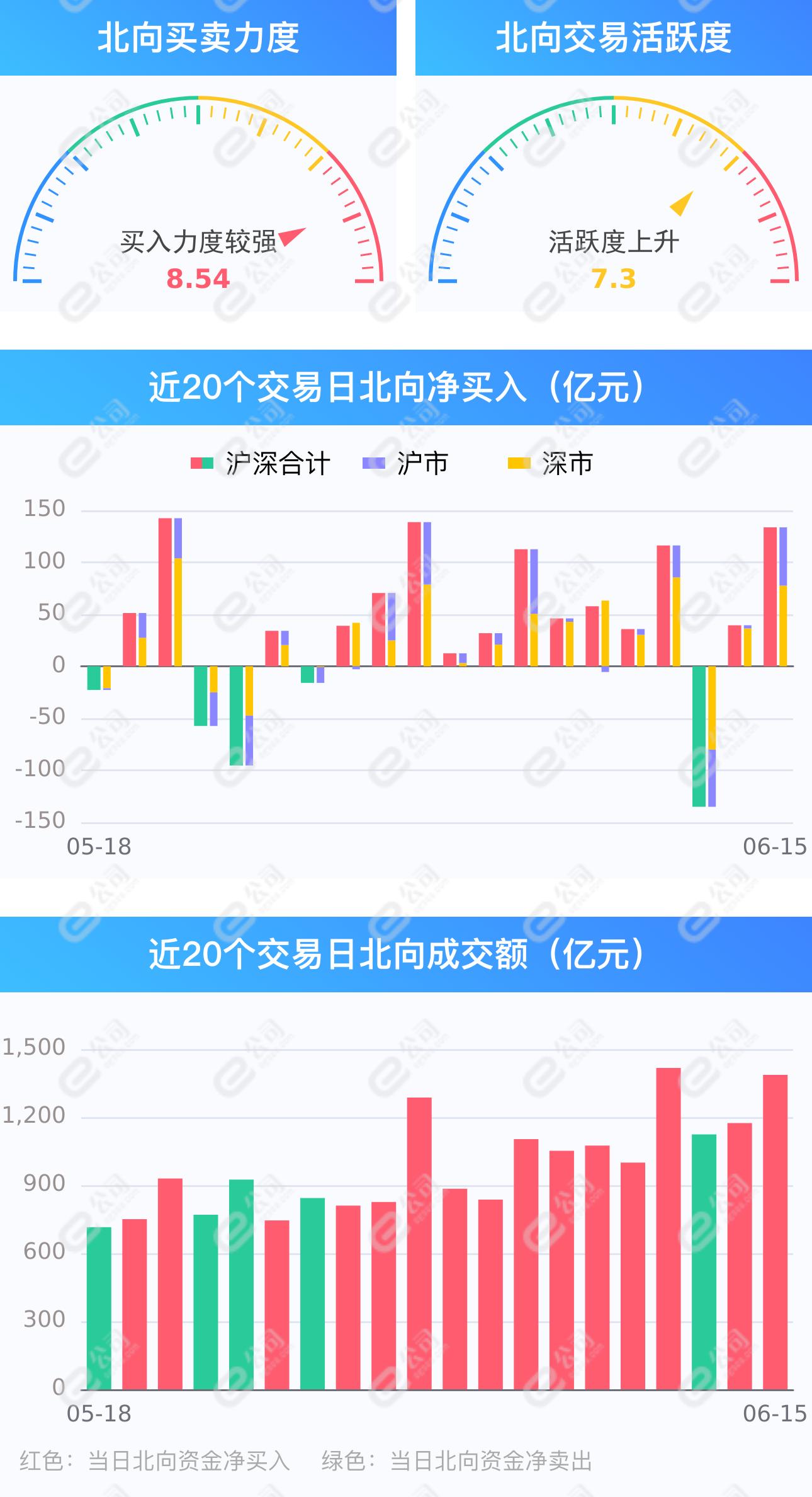 证券时报e公司讯,6月15日,截至A股收盘,统计数据显示北向资金合计净买入133.59亿元,其中沪股通净买入77.6亿元,深股通净买入55.99亿元。北向资金成交金额1385.96亿元,占A股总成交额10.72%,交易活跃度上升18.06%,其中沪股通买入金额362.49亿元,卖出金额284.89亿元,深股通买入金额397.28亿元,卖出金额341.29亿元。