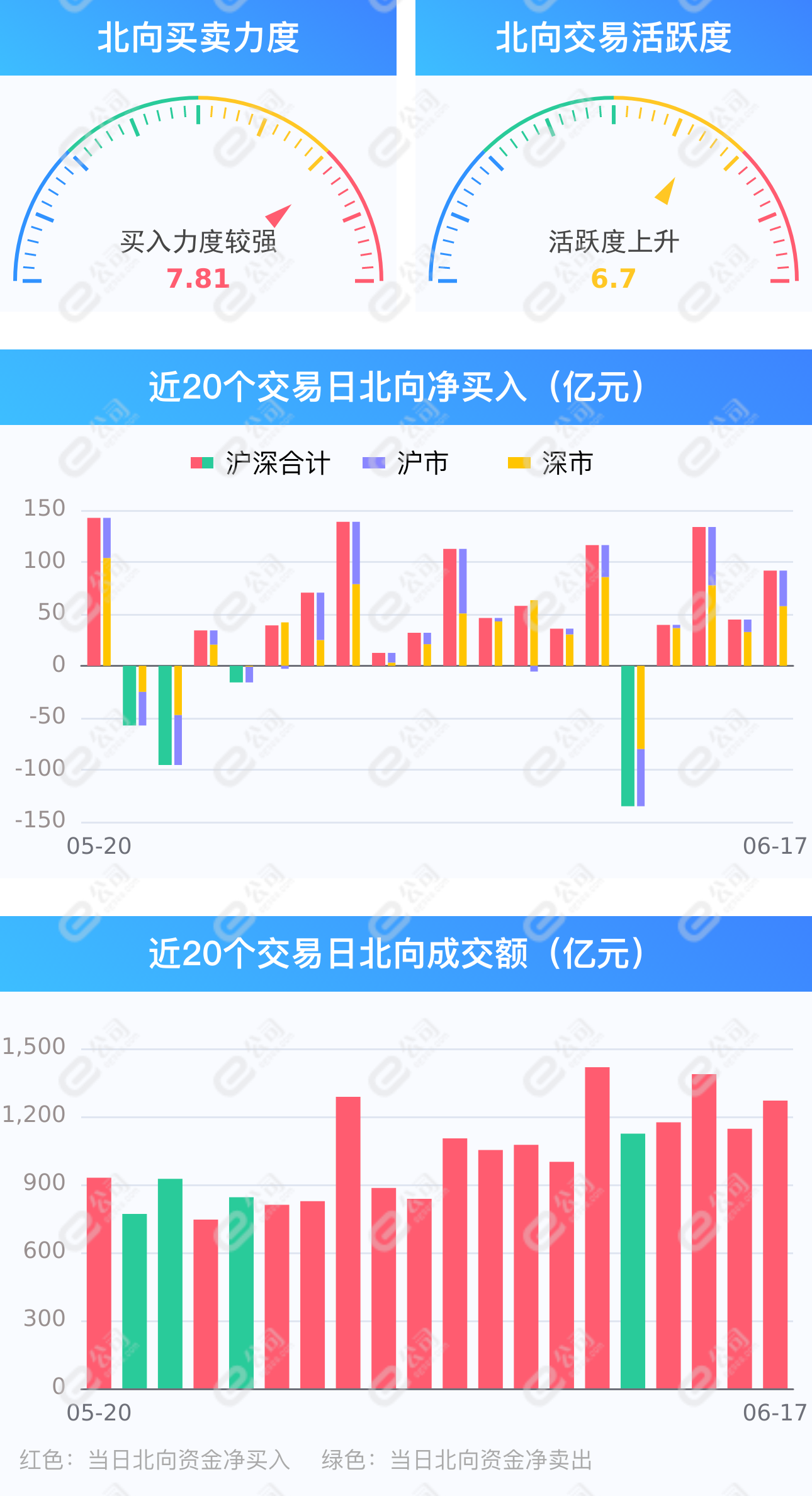 证券时报e公司讯,6月17日,截至A股收盘,统计数据显示北向资金合计净买入91.67亿元,其中沪股通净买入57.44亿元,深股通净买入34.23亿元。北向资金成交金额1269.62亿元,占A股总成交额11.69%,交易活跃度上升10.90%,其中沪股通买入金额326.94亿元,卖出金额269.50亿元,深股通买入金额353.71亿元,卖出金额319.48亿元。北向资金保持连续4日净买入,净买入额分别为39.45亿元、133.59亿元、44.52亿元、91.67亿元,合计净买入309.23亿元。