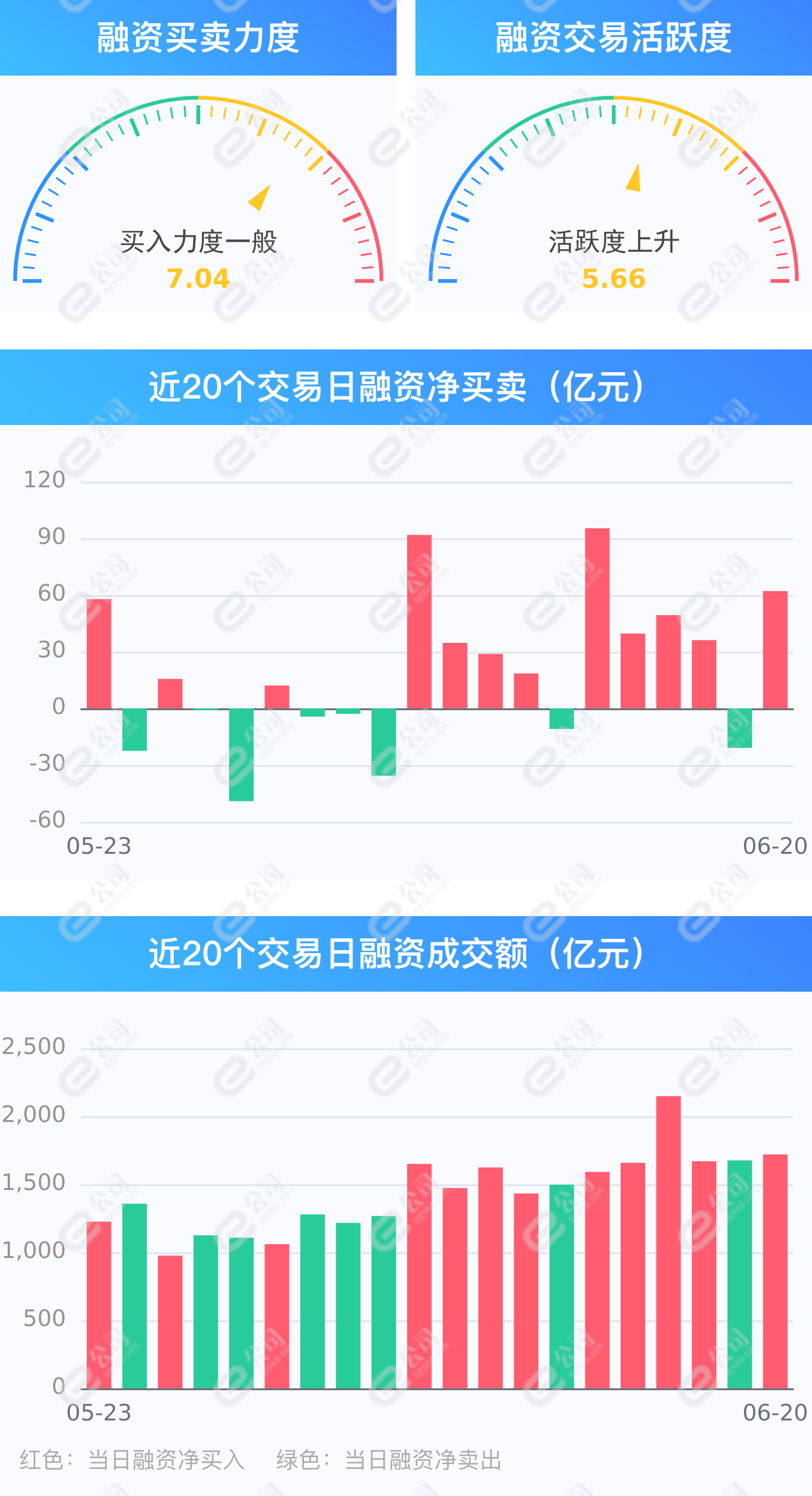 证券时报e公司讯,截至6月20日,上交所融资余额报7984.02亿元,较前一交易日增加44.61亿元;深交所融资余额报6847.44亿元,较前一交易日增加17.45亿元;两市合计14831.46亿元,较前一交易日增加62.07亿元,融资交易额1719.64亿元,占A股成交额14.84%,其中融资买入额890.86亿元,融资偿还额828.79亿元,交易活跃度上升2.62%。