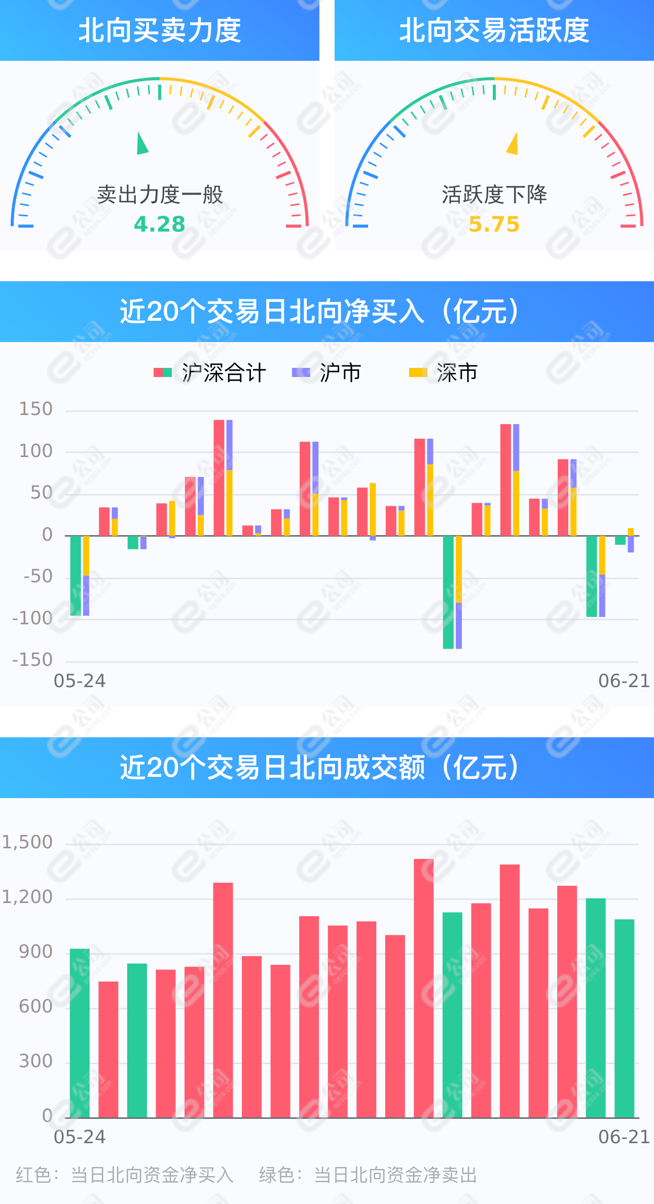 证券时报e公司讯,6月21日,截至A股收盘,统计数据显示北向资金合计净卖出10.63亿元,其中沪股通净买入9.23亿元,深股通净卖出19.86亿元。北向资金成交金额1085.43亿元,占A股总成交额10.09%,交易活跃度下降9.59%。
