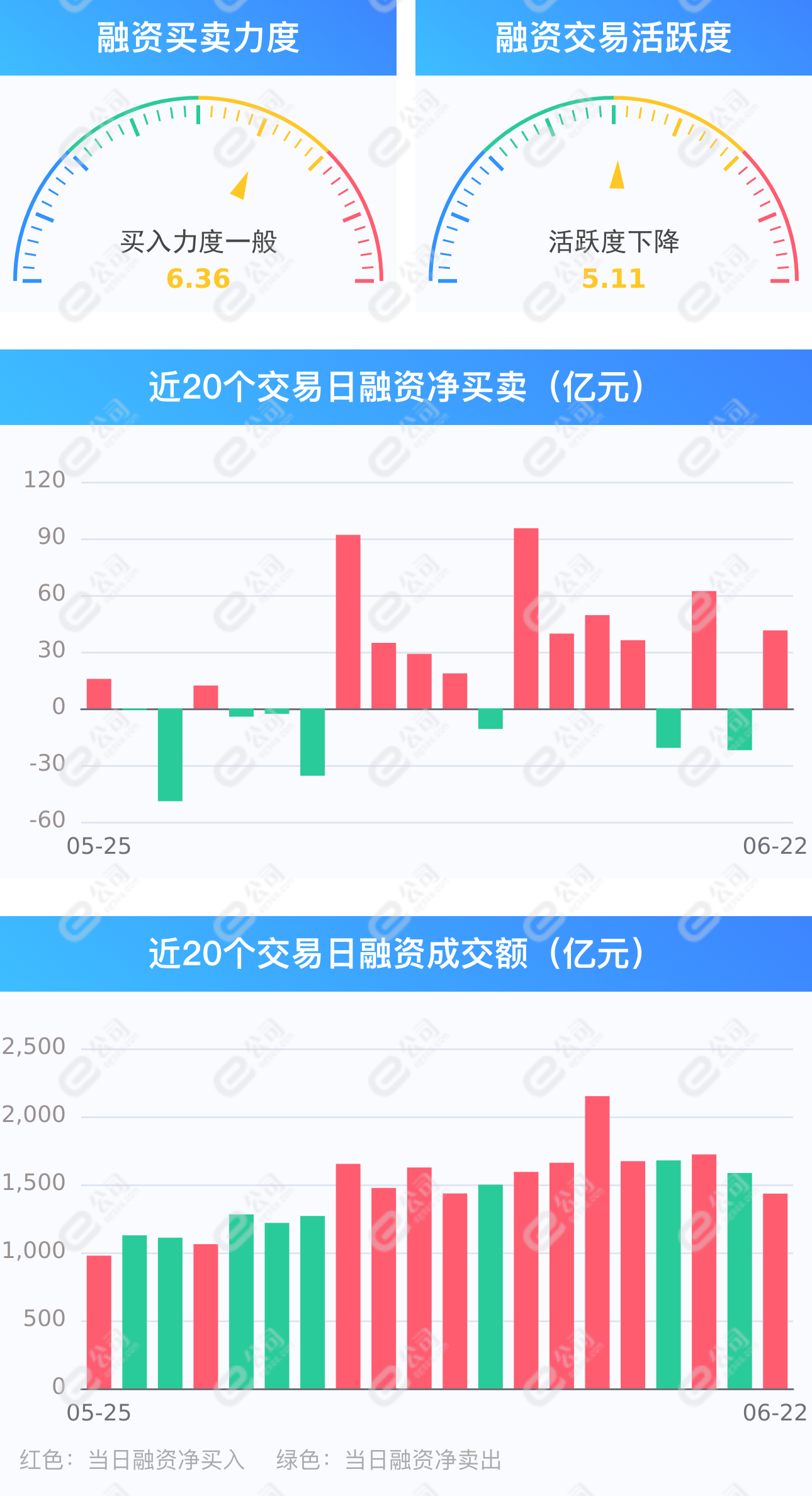 证券时报e公司讯,截至6月22日,上交所融资余额报7990.32亿元,较前一交易日增加22.41亿元;深交所融资余额报6860.21亿元,较前一交易日增加18.84亿元;两市合计14850.54亿元,较前一交易日增加41.25亿元,融资交易额1431.81亿元,占A股成交额14.42%,其中融资买入额736.53亿元,融资偿还额695.28亿元,交易活跃度下降9.59%。