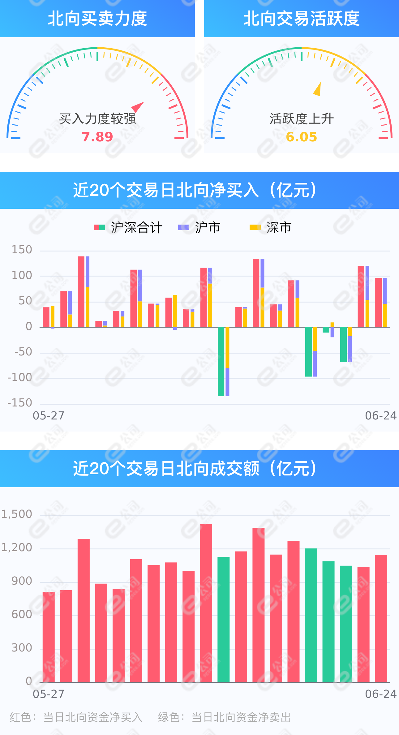 证券时报网讯,6月24日,截至A股收盘,统计数据显示北向资金合计净买入96.18亿元,其中沪股通净买入45.39亿元,深股通净买入50.79亿元。北向资金成交金额1143.61亿元,占A股总成交额9.92%,交易活跃度上升10.71%。