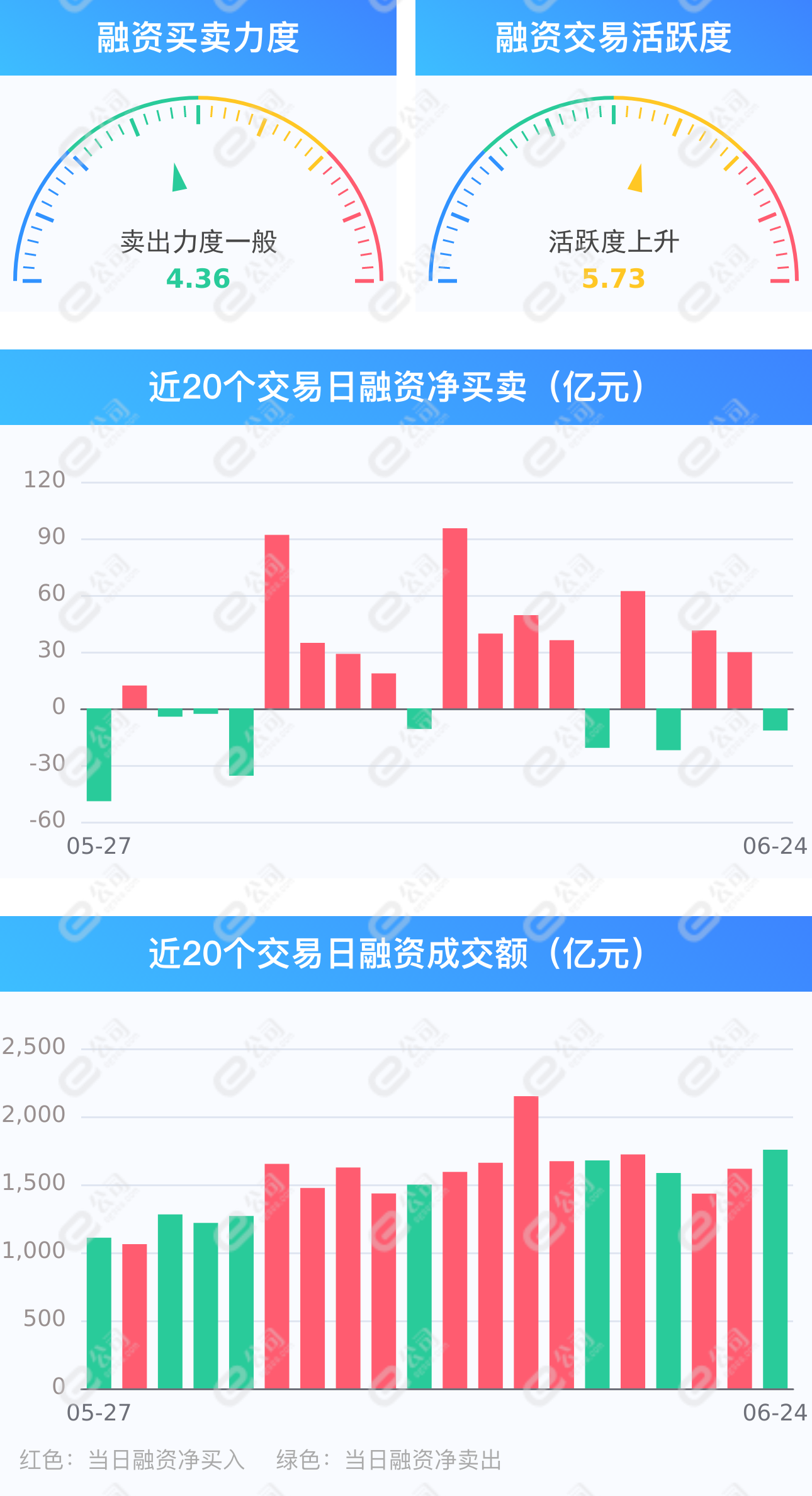 证券时报e公司讯,截至6月24日,上交所融资余额报7991.02亿元,较前一交易日减少3.68亿元;深交所融资余额报6877.48亿元,较前一交易日减少8.06亿元;两市合计14868.50亿元,较前一交易日减少11.75亿元,融资交易额1754.73亿元,占A股成交额15.22%,其中融资买入额871.49亿元,融资偿还额883.24亿元,交易活跃度上升8.67%。