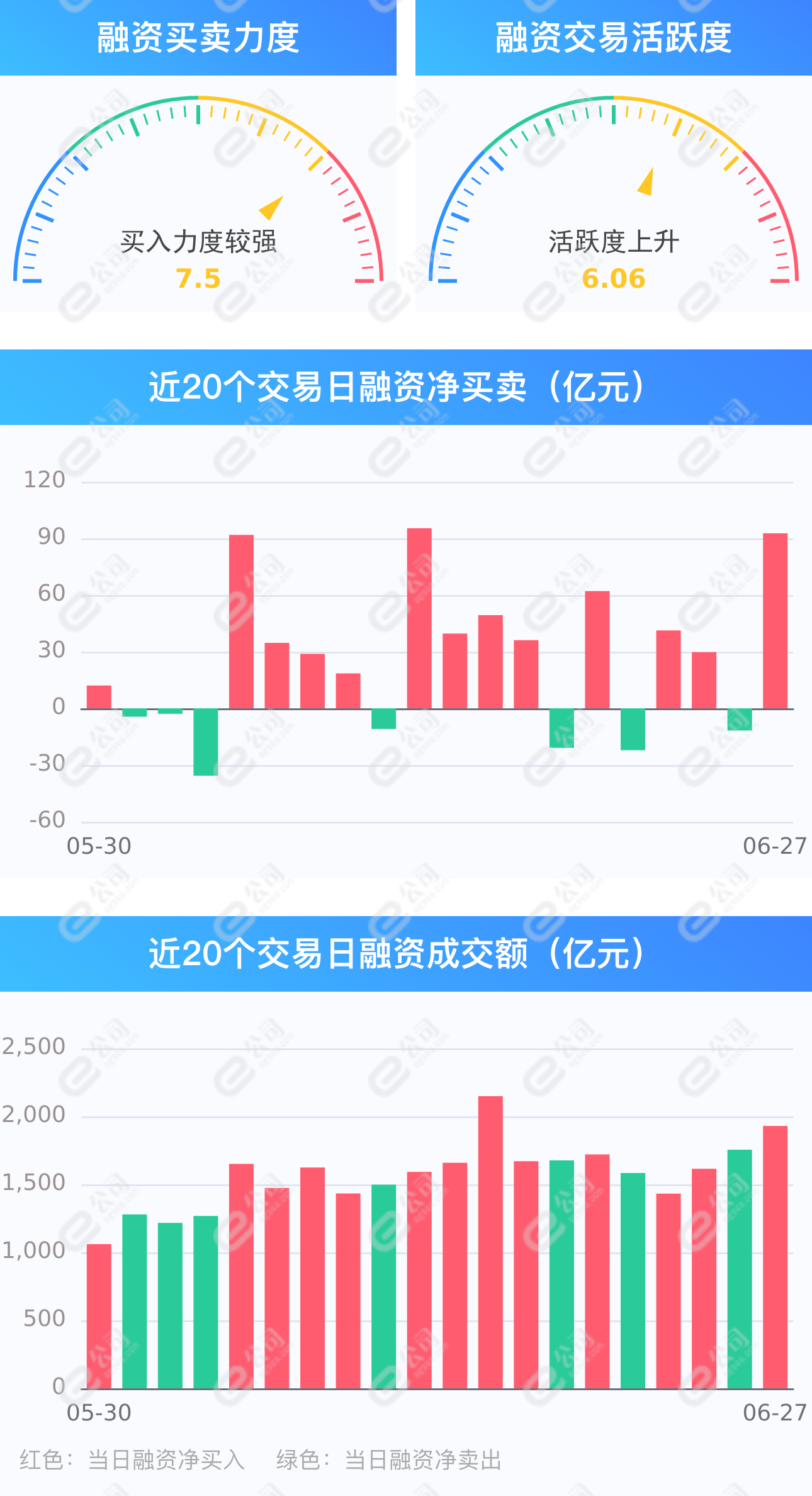 证券时报e公司讯,截至6月27日,上交所融资余额报8041.53亿元,较前一交易日增加50.51亿元;深交所融资余额报6919.61亿元,较前一交易日增加42.14亿元;两市合计14961.14亿元,较前一交易日增加92.64亿元,融资交易额1929.89亿元,占A股成交额15.79%,其中融资买入额1011.27亿元,融资偿还额918.62亿元,交易活跃度上升9.98%。