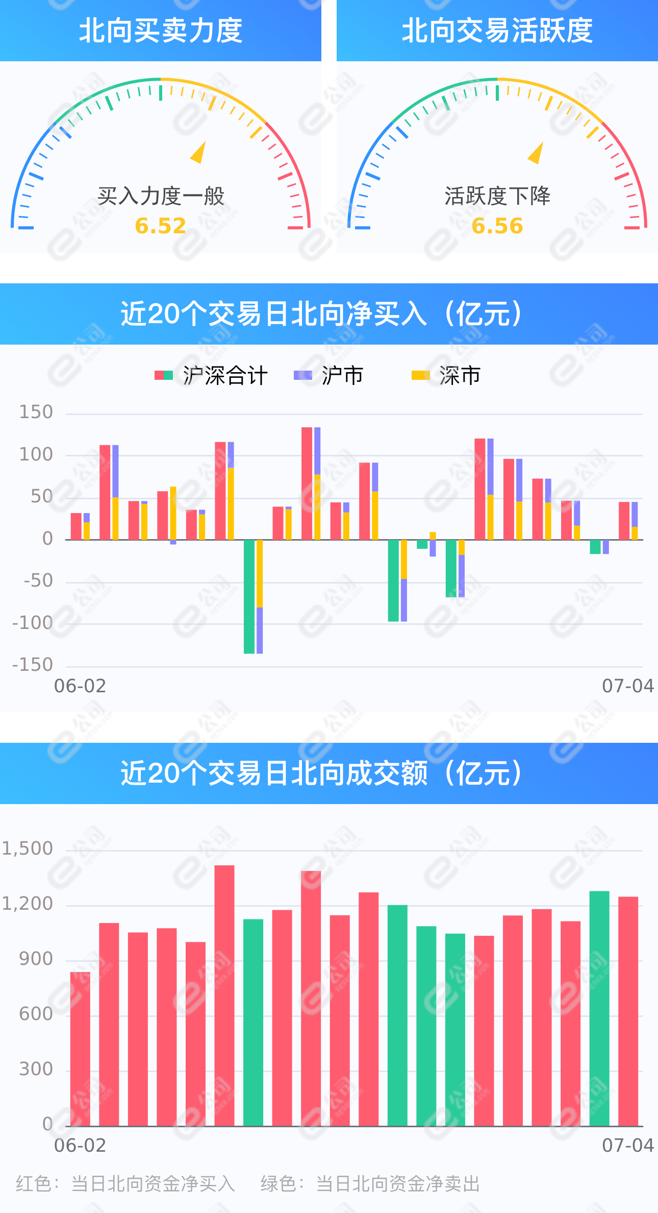 证券时报e公司讯,7月4日,截至A股收盘,统计数据显示北向资金合计净买入45.01亿元,其中沪股通净买入15.43亿元,深股通净买入29.58亿元。北向资金成交金额1245.74亿元,占A股总成交额11.08%,交易活跃度下降2.42%,其中沪股通买入金额292.13亿元,卖出金额276.70亿元,深股通买入金额353.24亿元,卖出金额323.66亿元。(此稿由证券时报e公司写稿机器人“快手小e”完成。)