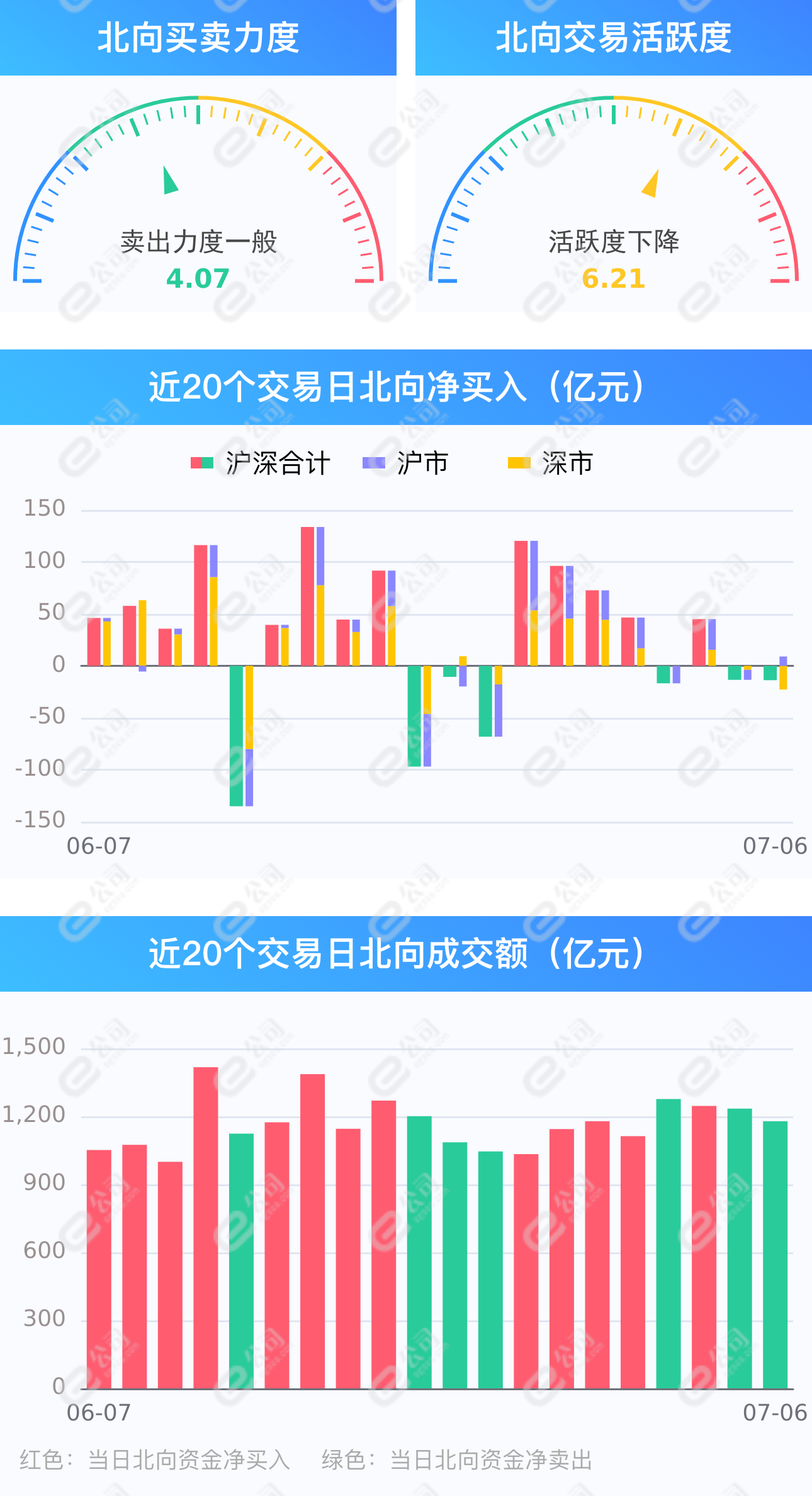 证券时报网讯,7月6日,截至A股收盘,统计数据显示北向资金合计净卖出13.82亿元,其中沪股通净卖出22.81亿元,深股通净买入8.99亿元。北向资金成交金额1178.75亿元,占A股总成交额10.89%,交易活跃度下降4.46%,其中沪股通买入金额262.51亿元,卖出金额285.32亿元,深股通买入金额319.95亿元,卖出金额310.96亿元。