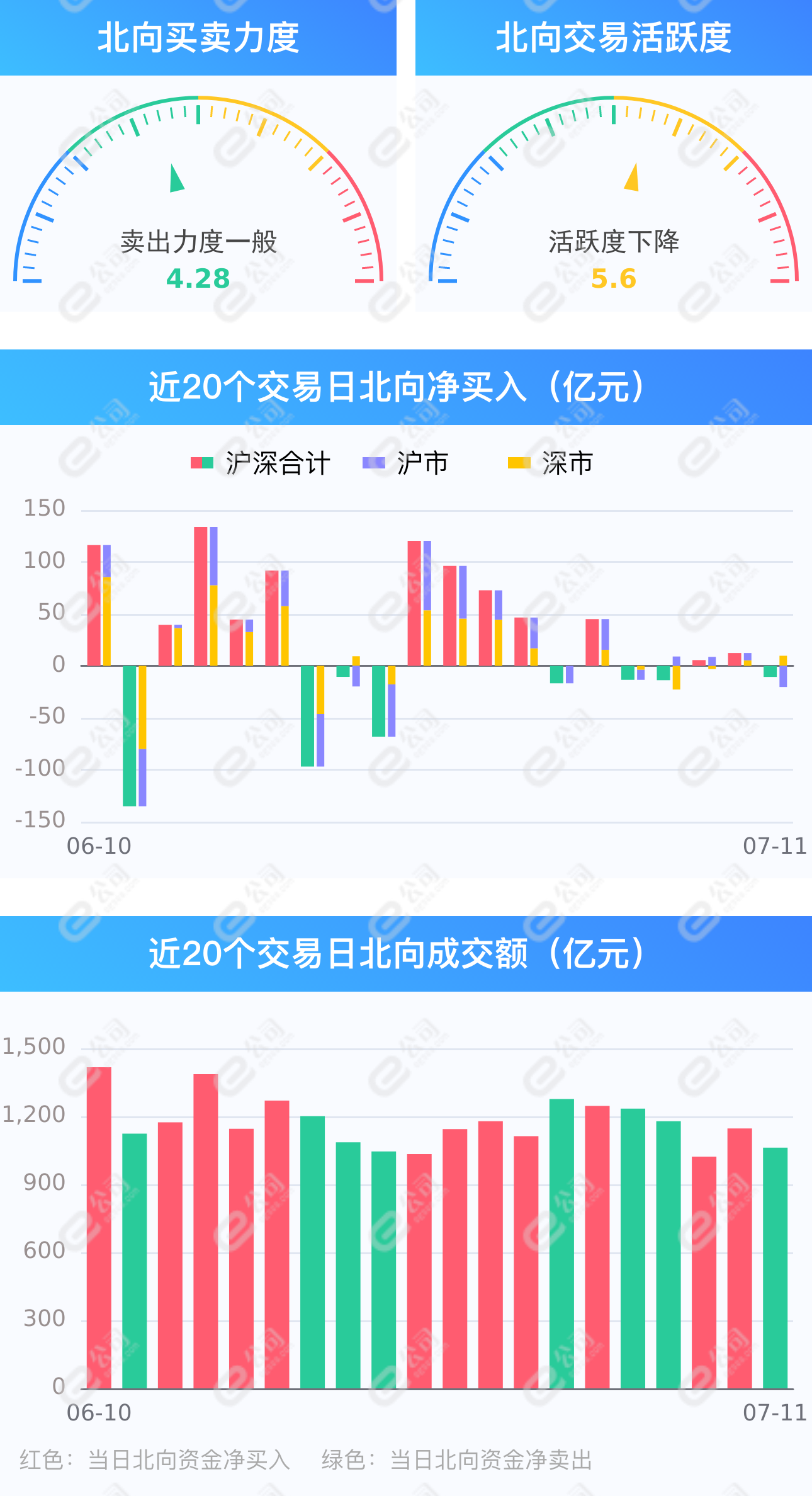 证券时报e公司讯,7月11日,截至A股收盘,统计数据显示北向资金合计净卖出10.69亿元,其中沪股通净买入9.7亿元,深股通净卖出20.39亿元。北向资金成交金额1062亿元,占A股总成交额10.53%,交易活跃度下降7.36%。