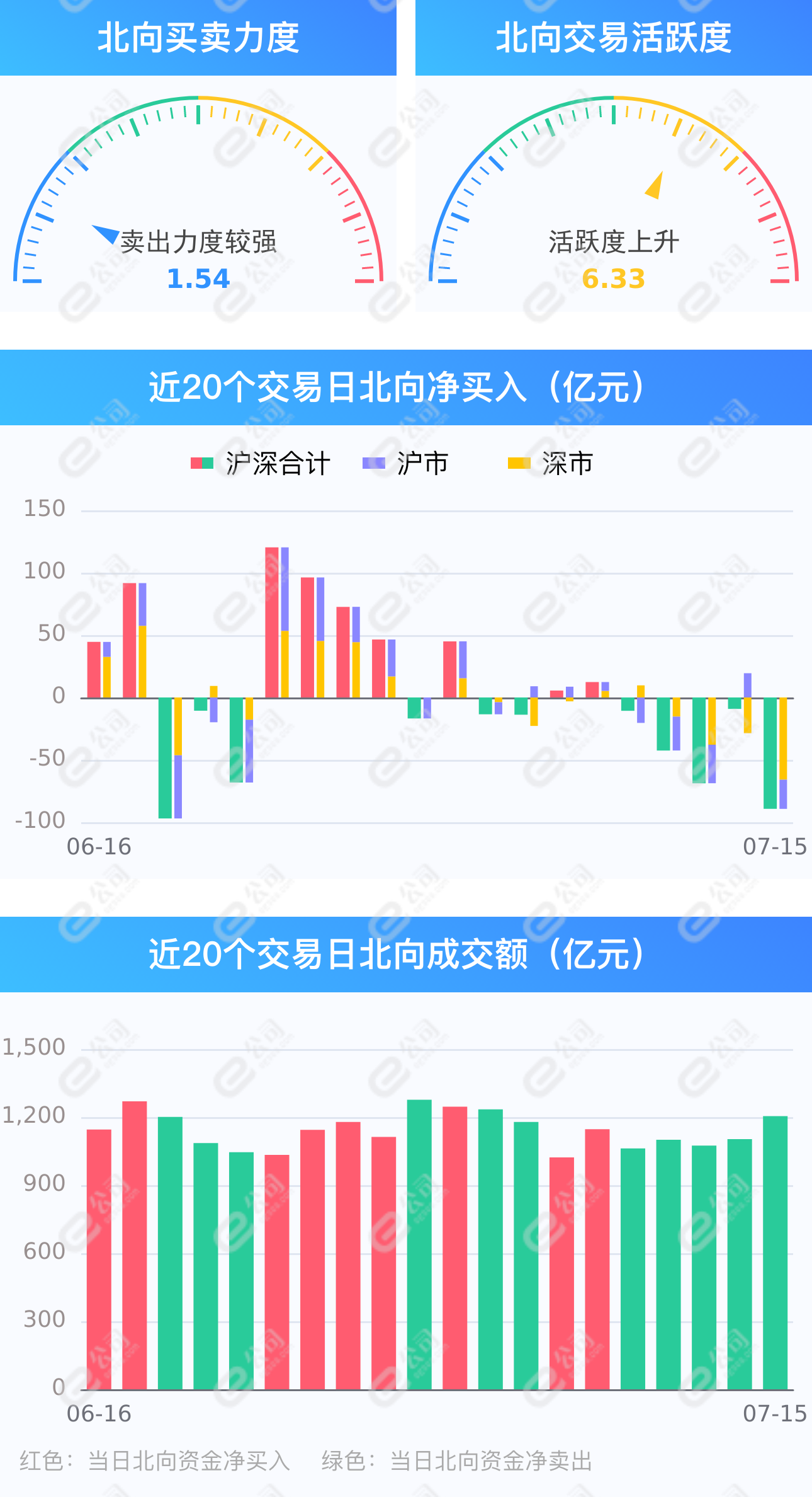 证券时报e公司讯,7月15日,截至A股收盘,统计数据显示北向资金合计净卖出89.3亿元,其中沪股通净卖出65.9亿元,深股通净卖出23.4亿元。北向资金成交金额1204.3亿元,占A股总成交额11.07%,交易活跃度上升9.19%。北向资金保持连续5日净卖出,净卖出额分别为10.69亿元、42.51亿元、68.75亿元、9.17亿元、89.30亿元,合计净卖出220.42亿元。