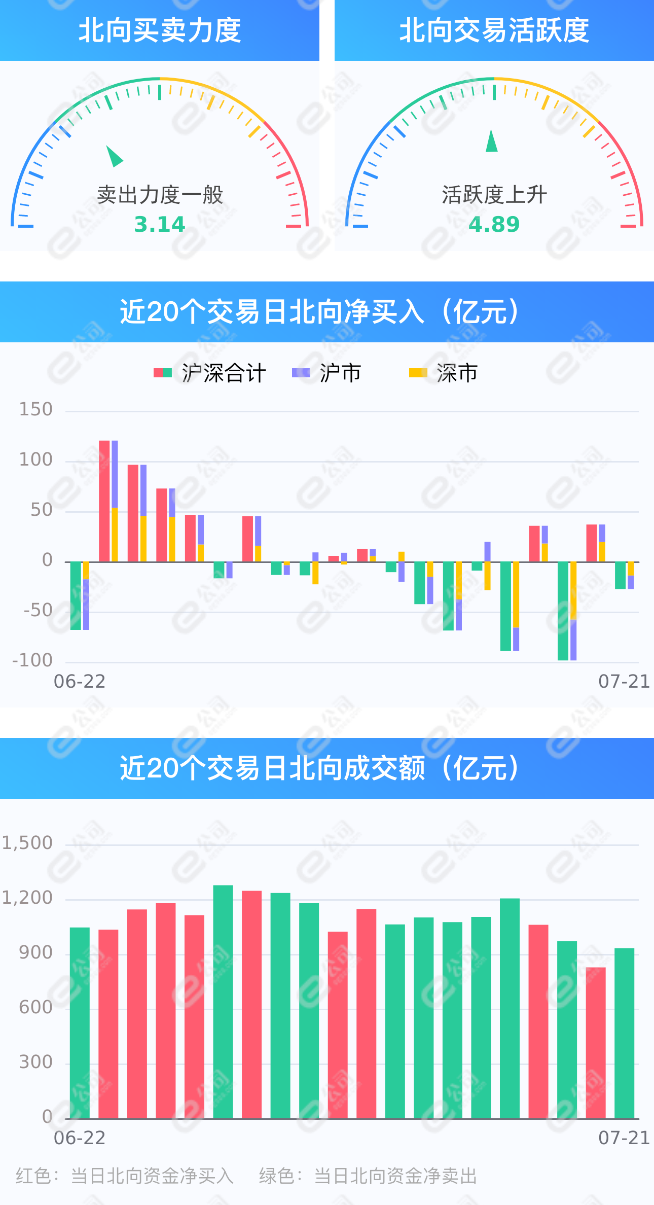 证券时报e公司讯,7月21日,截至A股收盘,统计数据显示北向资金合计净卖出27.53亿元,其中沪股通净卖出14.07亿元,深股通净卖出13.46亿元。北向资金成交金额931.69亿元,占A股总成交额9.21%,交易活跃度上升12.70%,其中沪股通买入金额195.34亿元,卖出金额209.41亿元,深股通买入金额256.74亿元,卖出金额270.20亿元。