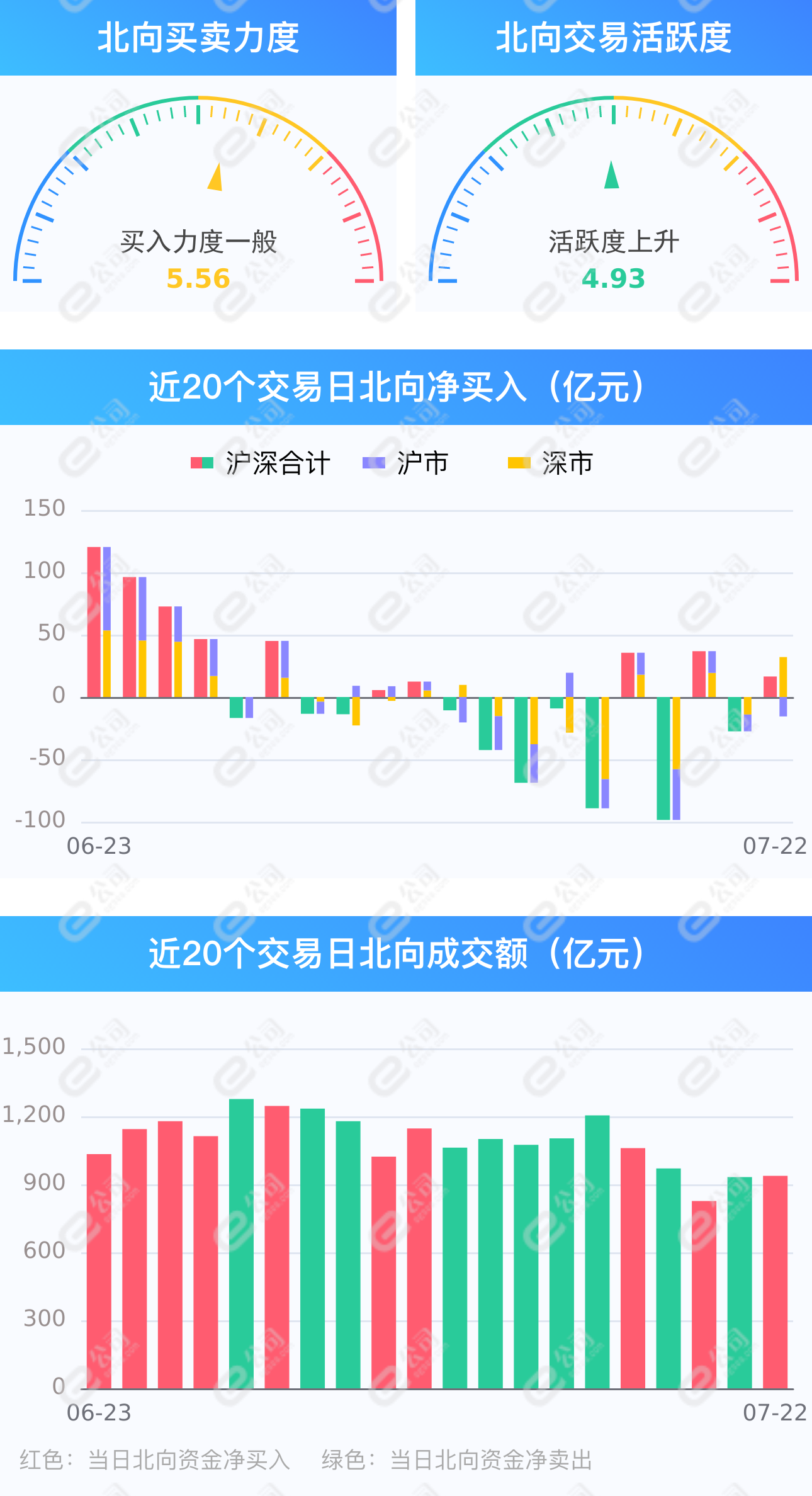 证券时报网讯,7月22日,截至A股收盘,统计数据显示北向资金合计净买入16.45亿元,其中沪股通净买入32.03亿元,深股通净卖出15.58亿元。北向资金成交金额937.79亿元,占A股总成交额10.02%,交易活跃度上升0.65%,其中沪股通买入金额222.75亿元,卖出金额190.72亿元,深股通买入金额254.37亿元,卖出金额269.95亿元。