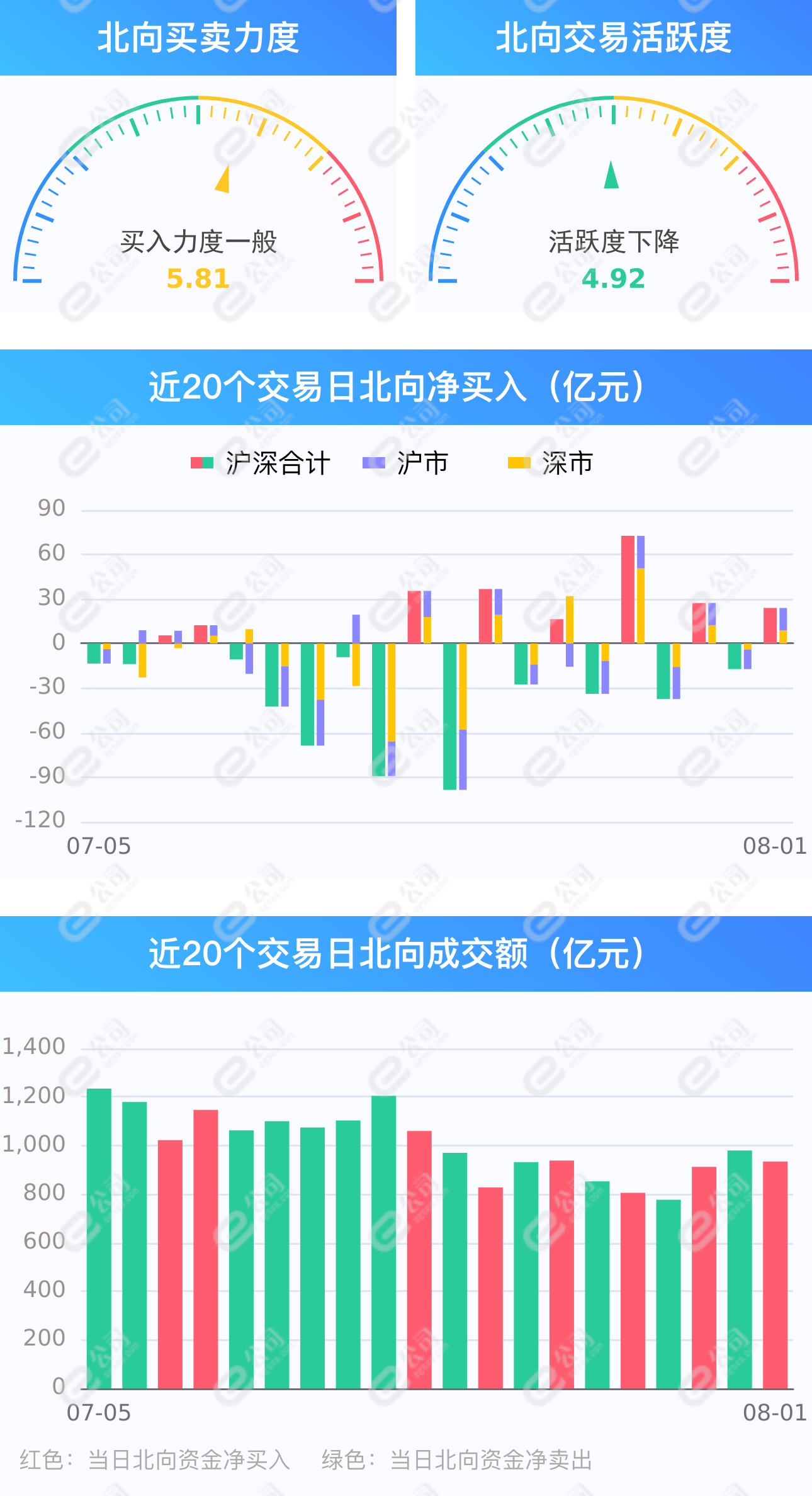证券时报网讯,8月1日,截至A股收盘,统计数据显示北向资金合计净买入23.99亿元,其中沪股通净买入8.93亿元,深股通净买入15.06亿元。北向资金成交金额934.04亿元,占A股总成交额9.40%,交易活跃度下降4.62%,其中沪股通买入金额203.74亿元,卖出金额194.81亿元,深股通买入金额275.27亿元,卖出金额260.21亿元。