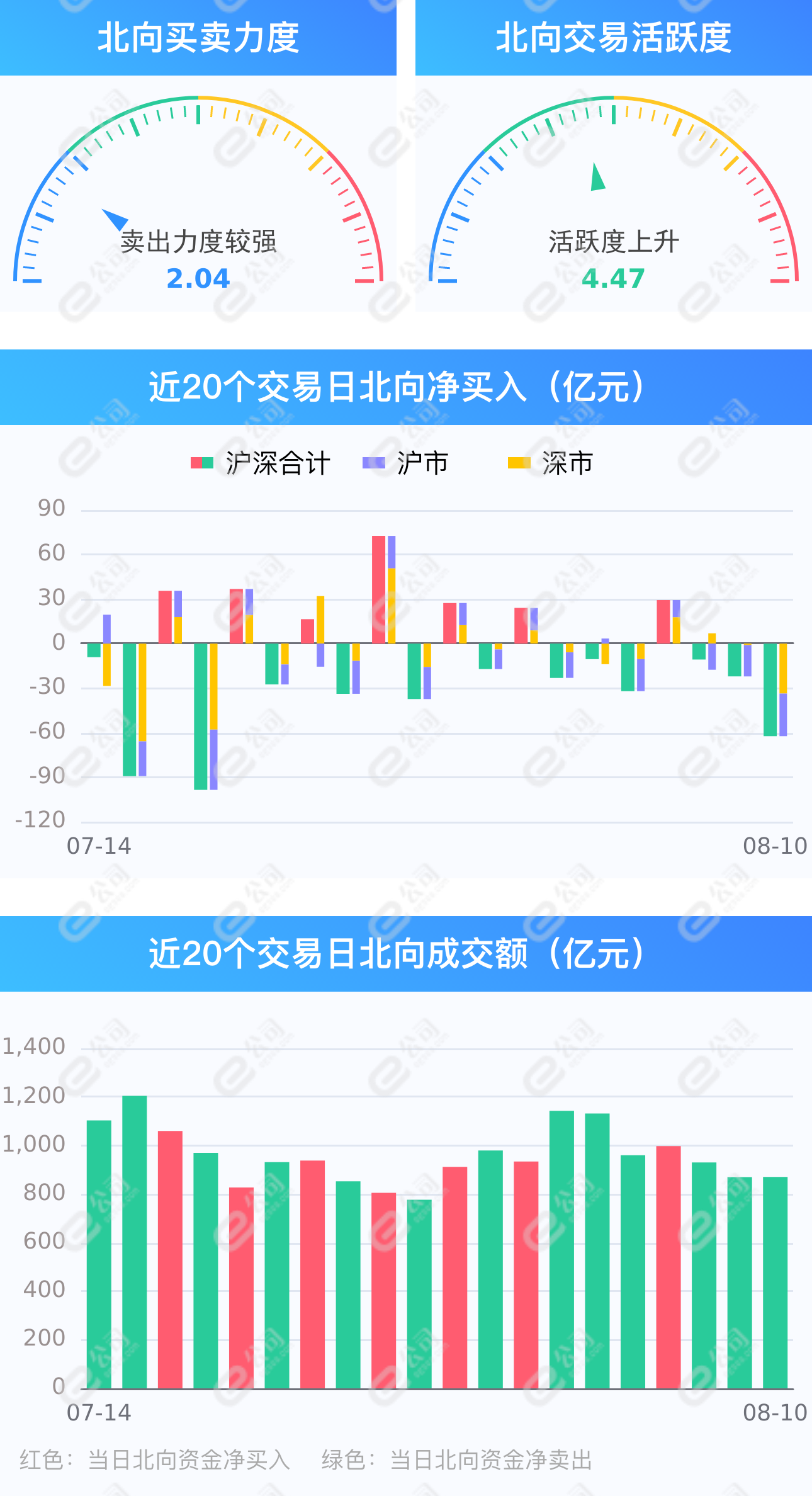 证券时报e公司讯,8月10日,截至A股收盘,统计数据显示北向资金合计净卖出62.36亿元,其中沪股通净卖出33.66亿元,深股通净卖出28.7亿元。北向资金成交金额870.34亿元,占A股总成交额9.01%,交易活跃度上升0.10%,其中沪股通买入金额170.53亿元,卖出金额204.19亿元,深股通买入金额233.46亿元,卖出金额262.16亿元。