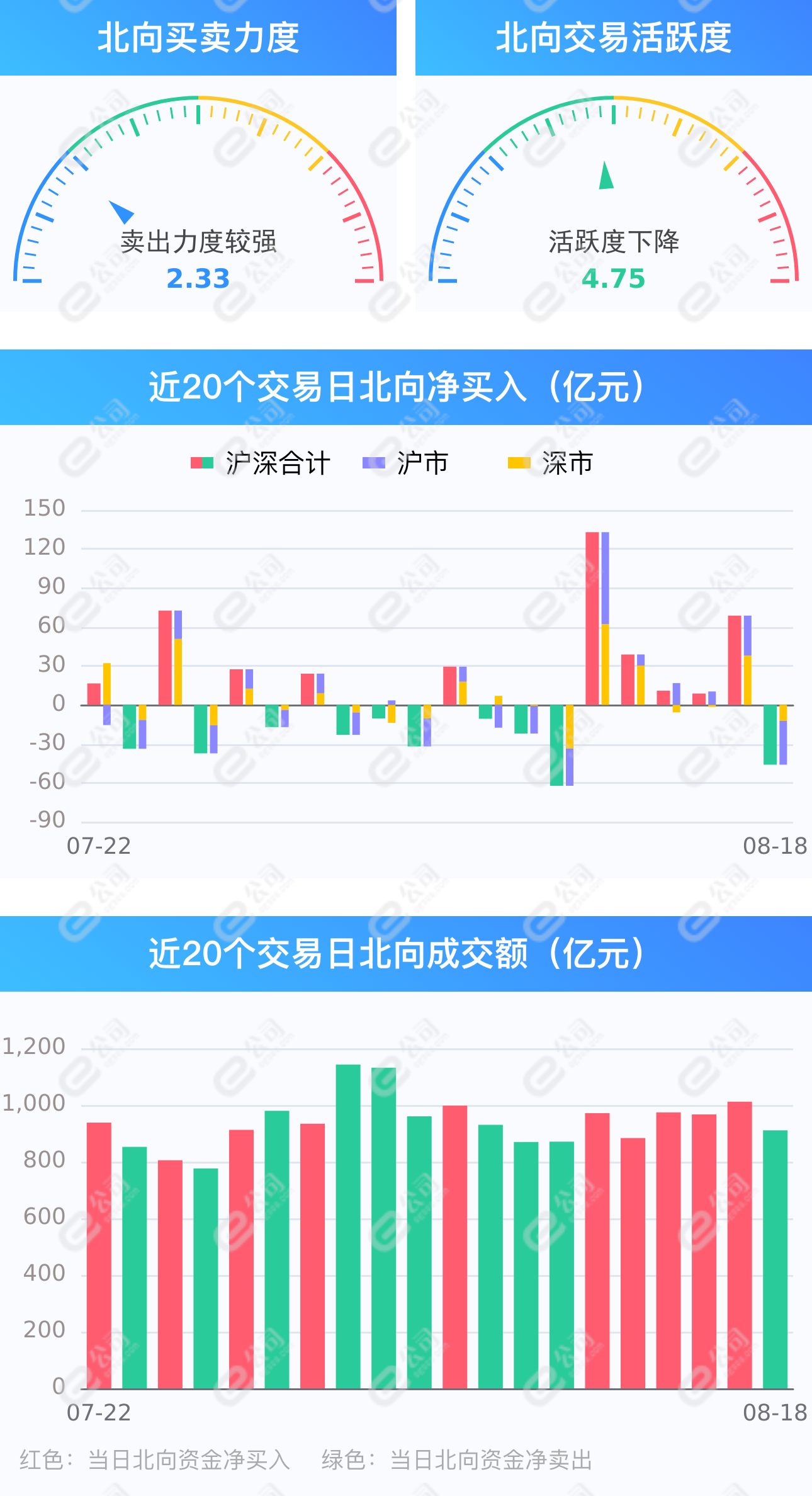 证券时报网讯,8月18日,截至A股收盘,统计数据显示北向资金合计净卖出46.13亿元,其中沪股通净卖出12.42亿元,深股通净卖出33.71亿元。北向资金成交金额910.79亿元,占A股总成交额8.70%,交易活跃度下降9.97%,其中沪股通买入金额181.56亿元,卖出金额193.98亿元,深股通买入金额250.77亿元,卖出金额284.48亿元。北向资金中止连续5日净买入。