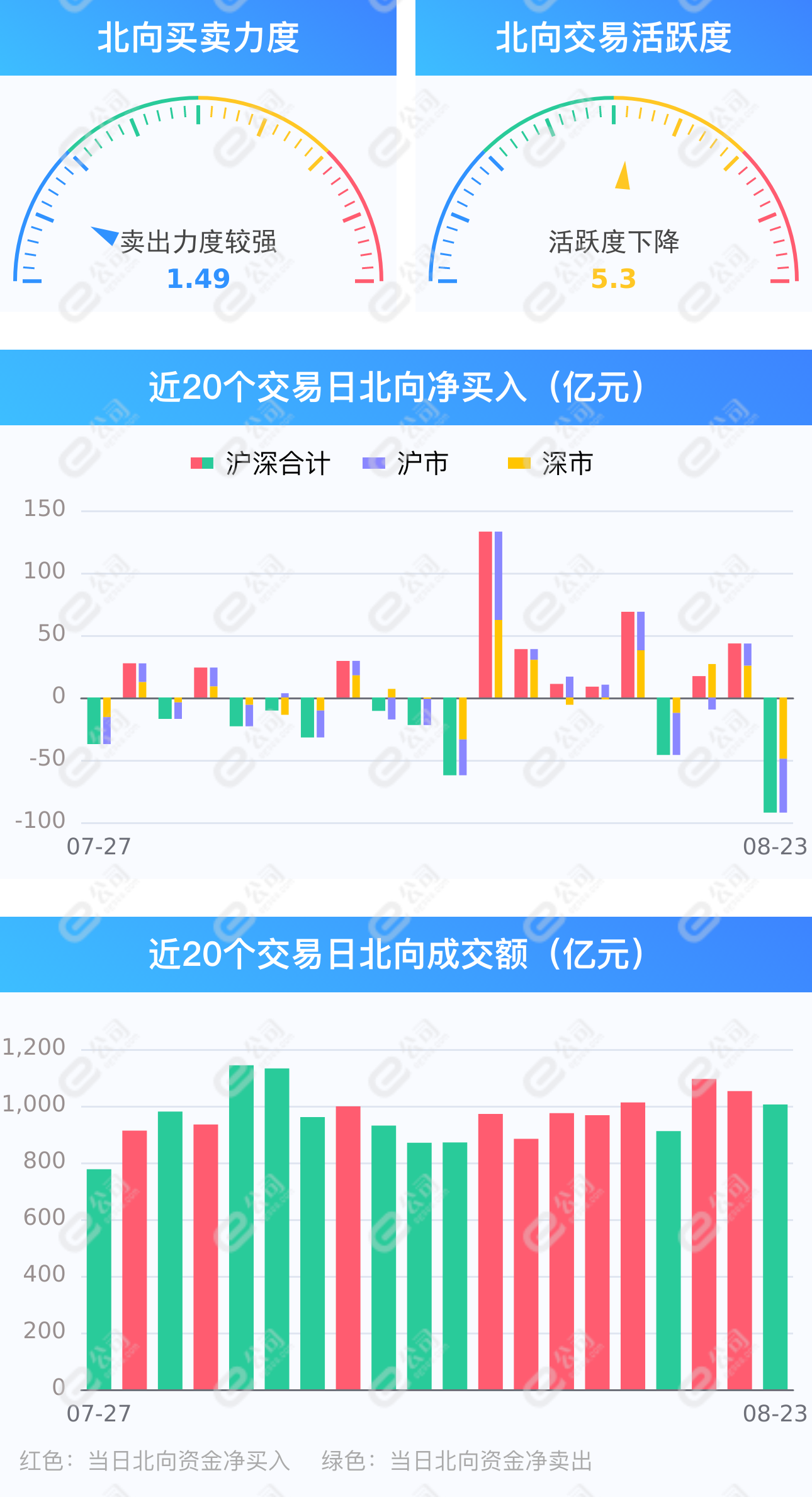 证券时报e公司讯,8月23日,截至A股收盘,统计数据显示北向资金合计净卖出92.28亿元,其中沪股通净卖出49.14亿元,深股通净卖出43.14亿元。北向资金成交金额1004.68亿元,占A股总成交额10.09%,交易活跃度下降4.48%。