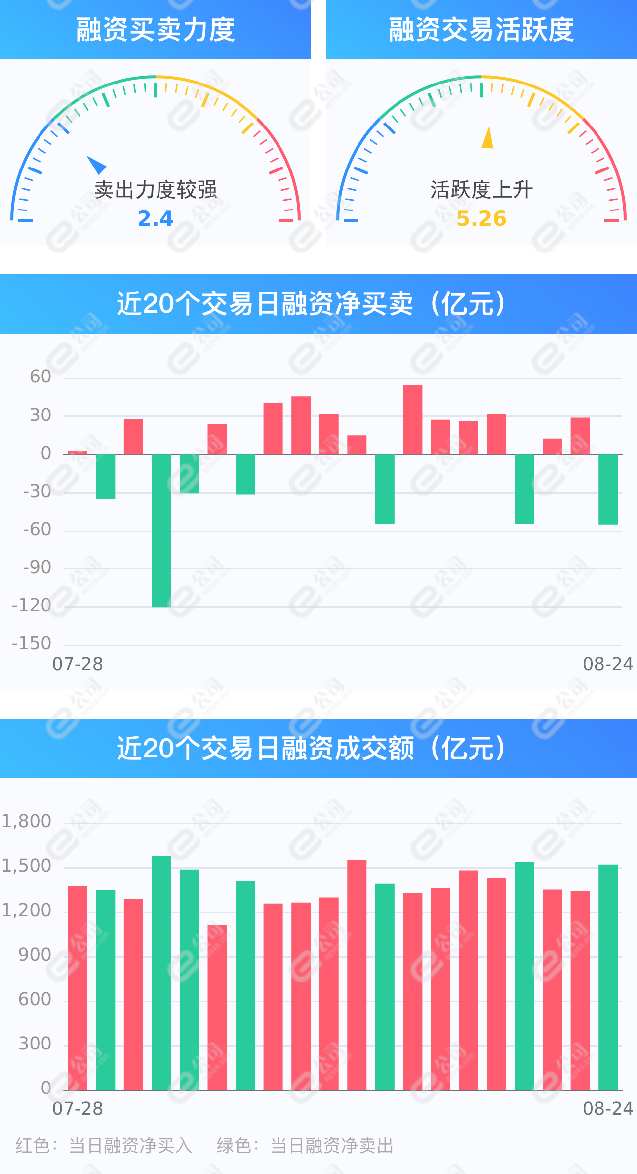 证券时报e公司讯,截至8月24日,上交所融资余额报8185.20亿元,较前一交易日减少27.53亿元;深交所融资余额报7108.39亿元,较前一交易日减少27.87亿元;两市合计15293.60亿元,较前一交易日减少55.40亿元,融资交易额1517.54亿元,占A股成交额13.48%,其中融资买入额731.07亿元,融资偿还额786.47亿元,交易活跃度上升13.34%。